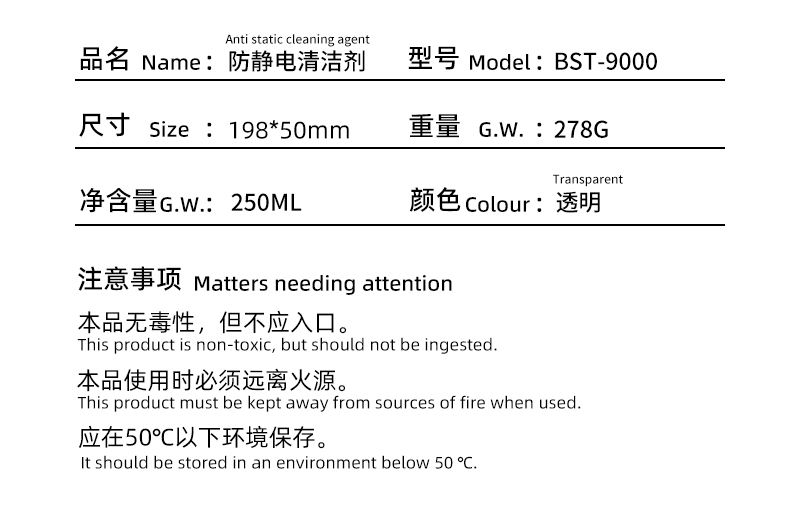 ? 产品名称: 防静电环保清洁剂? 产品型号: BST-9000? 产品类别: 清洁剂辅料系列