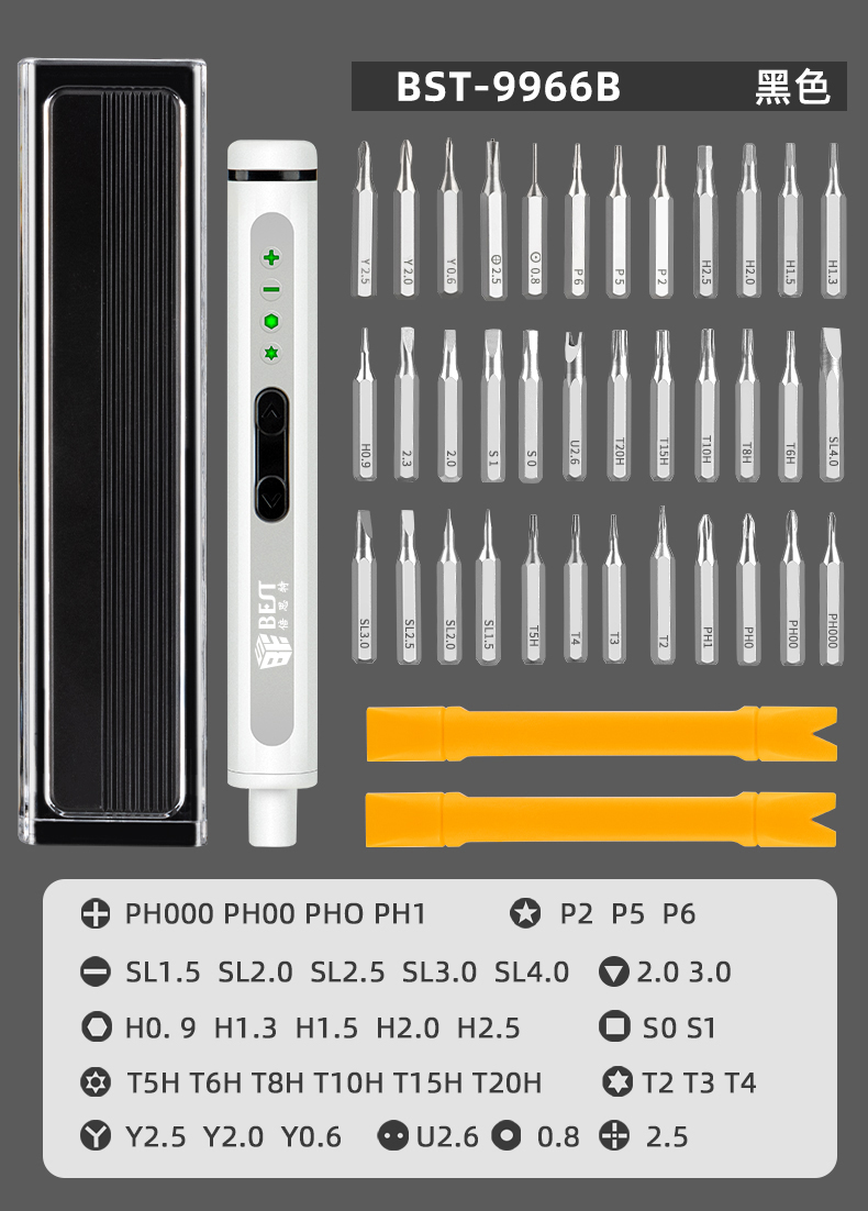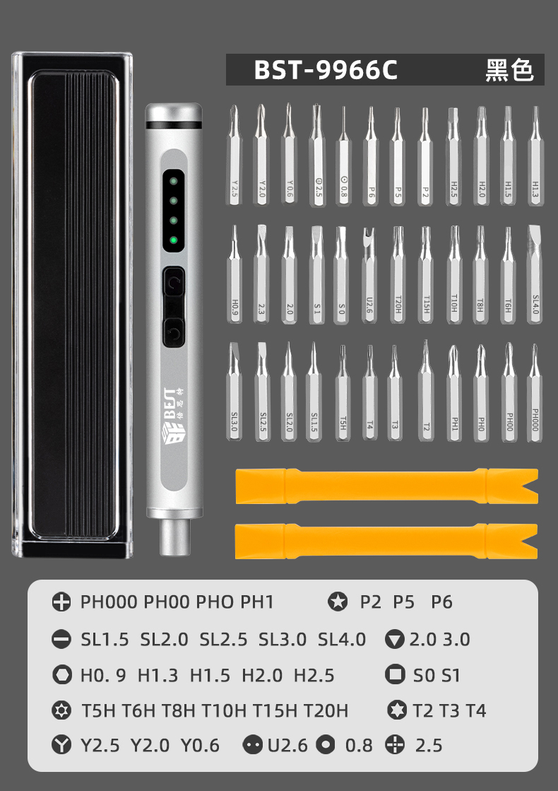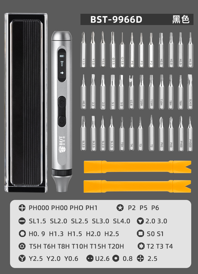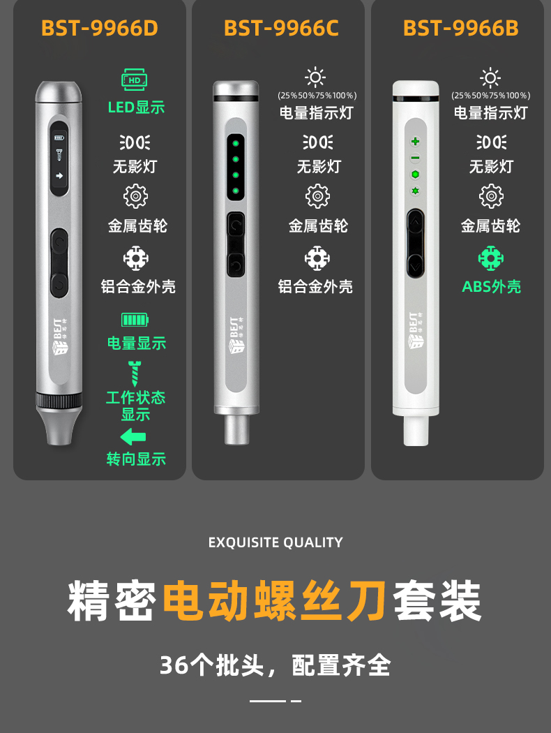 ? 产品名称: 电动精修螺丝刀套装? 产品型号: BST-9966B/9966C/9966D? 产品类别: 电动螺丝刀系列