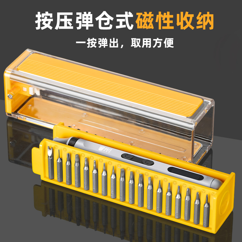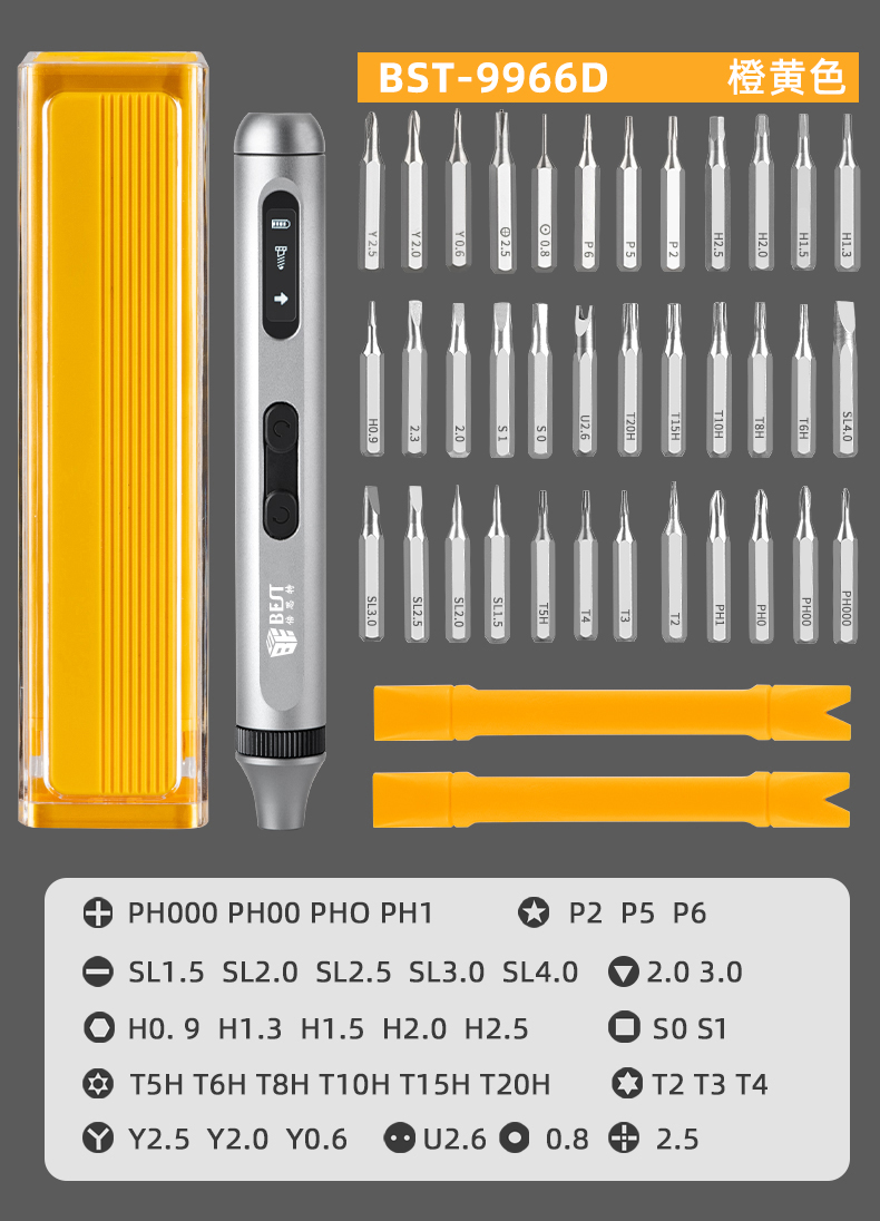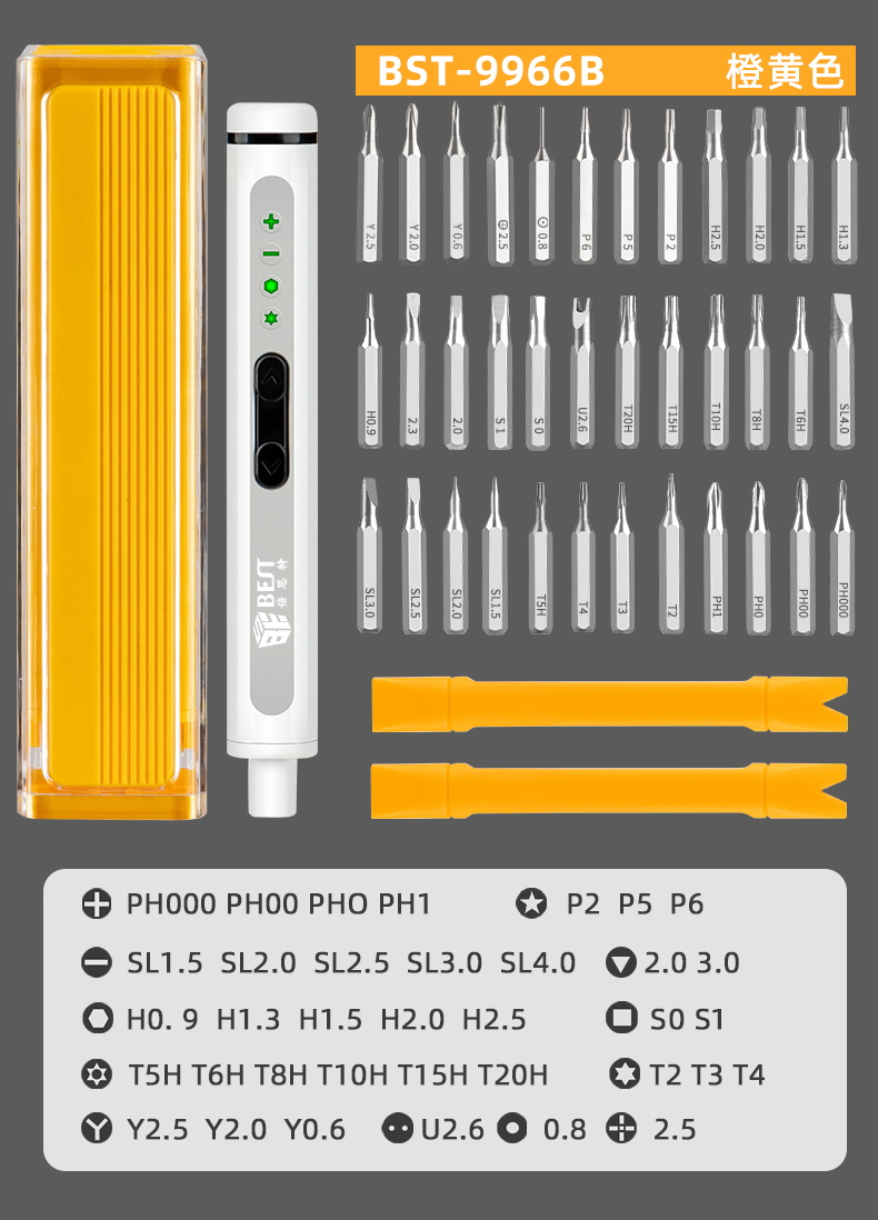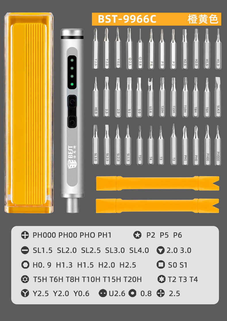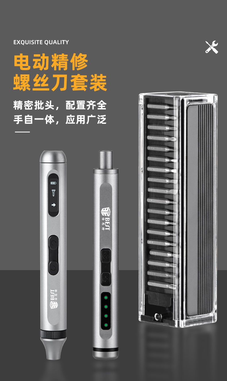 ? 产品名称: 电动精修螺丝刀套装? 产品型号: BST-9966B/9966C/9966D? 产品类别: 电动螺丝刀系列