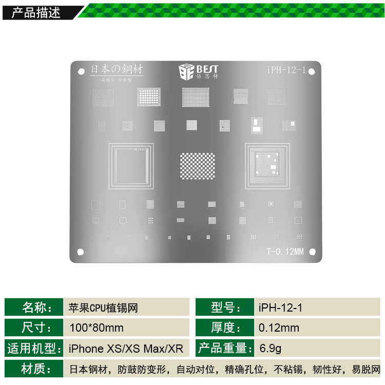 ? 产品名称: iPhone XS/XS Max/XR BGA植锡网? 产品型号: iPH-12-1? 产品类别: 植锡网系列
