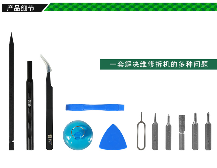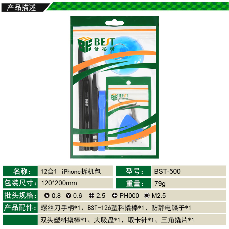 ? 产品名称: 12合1 iPhone拆机包? 产品型号: BST-500? 产品类别: 拆机工具系列