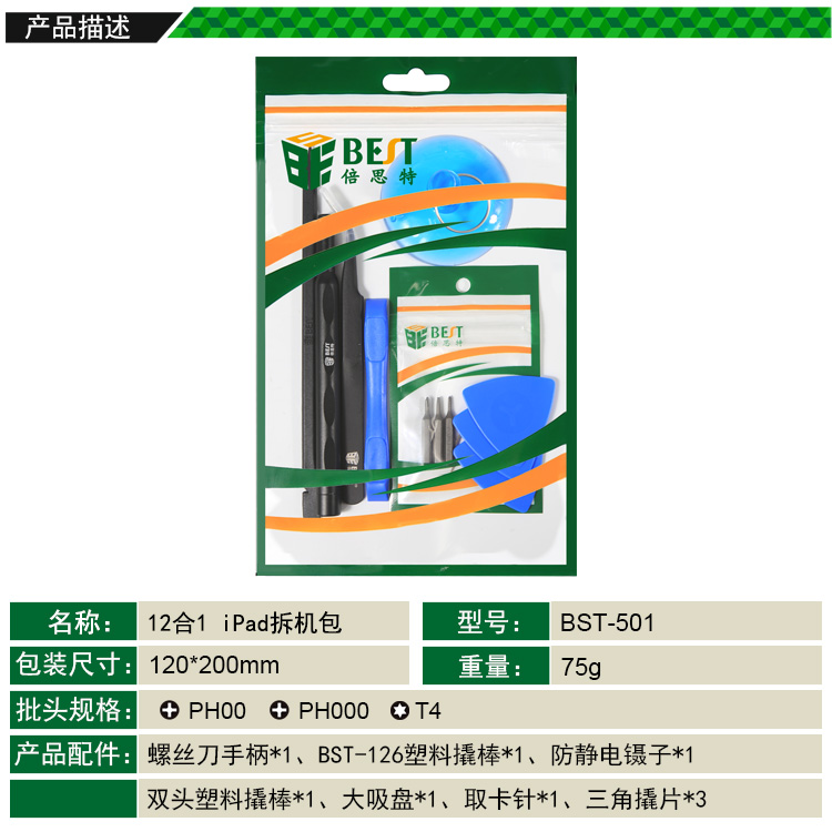 ? 产品名称: 12合1 iPad拆机包? 产品型号: BST-501? 产品类别: 拆机工具系列