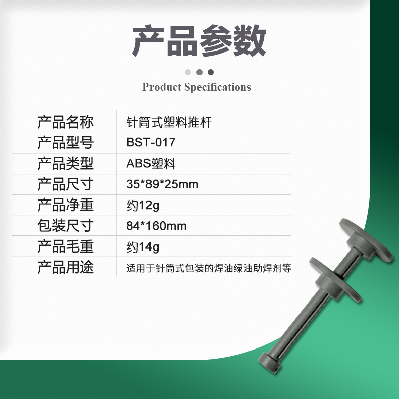 ? 产品名称: 塑料针筒助推杆? 产品型号: BST-017? 产品类别: 锡浆焊油系列