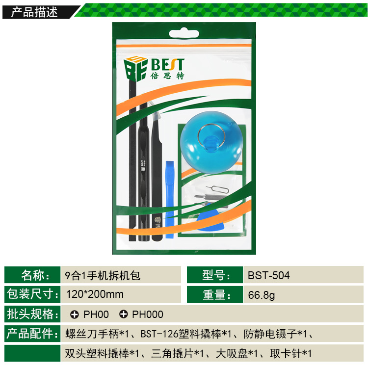 ? 产品名称: 9合1 三星手机拆机包? 产品型号: BST-504? 产品类别: 拆机工具系列