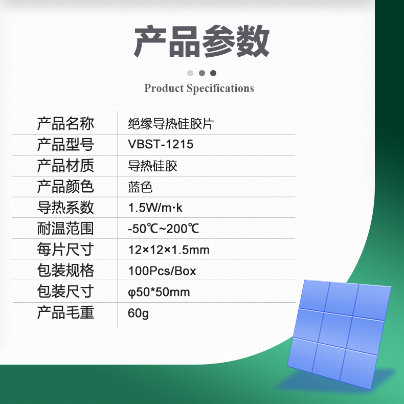 ? 产品名称: 绝缘导热硅胶片? 产品型号: VBST-1215? 产品类别: 综合类系列