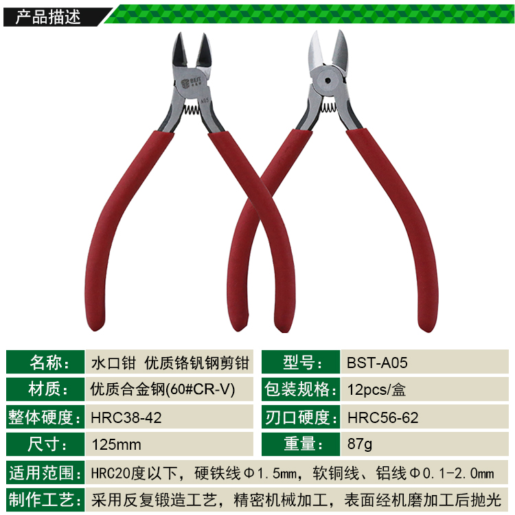 返回当前位置: 首页 / 产品中心 / BST-A05 优质铬钒钢电子剪钳 水口钳 塑料剪钳 5寸钳子