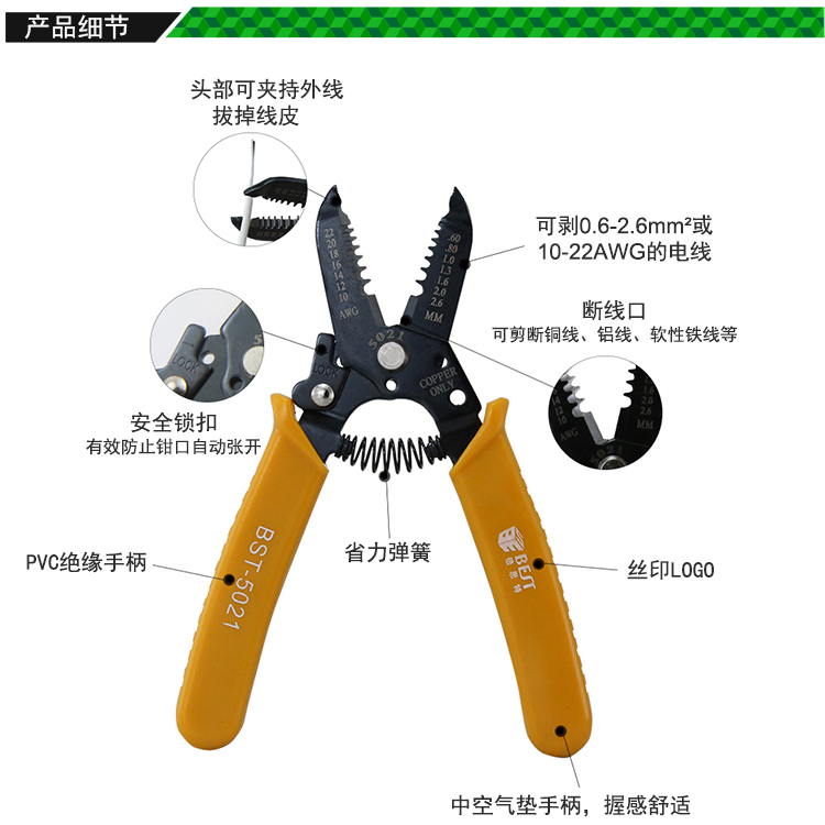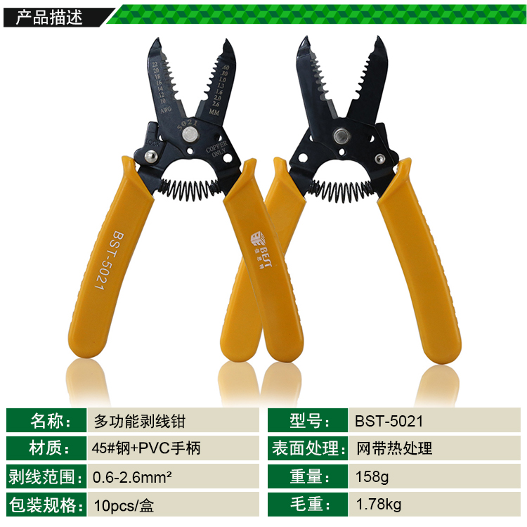 ? 产品名称: 剥线钳 电线钳 多功能剥线钳? 产品型号: BST-5021? 产品类别: 钳子系列