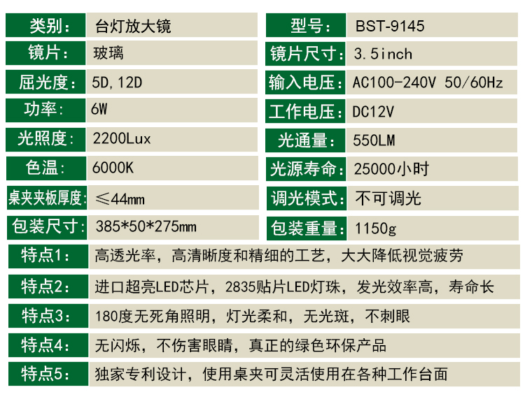 ? 产品名称: 白色LED放大镜台灯? 产品型号: BST-9145? 产品类别: 放大镜台灯系列