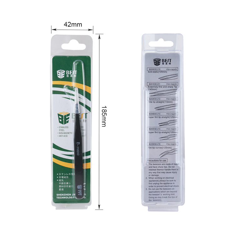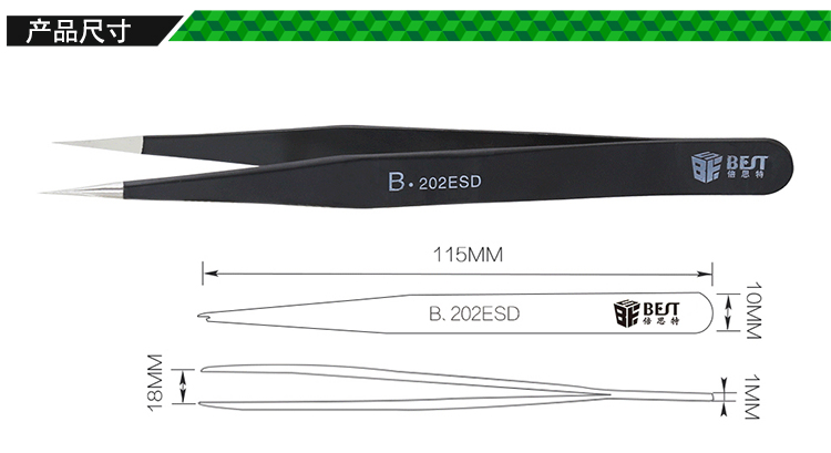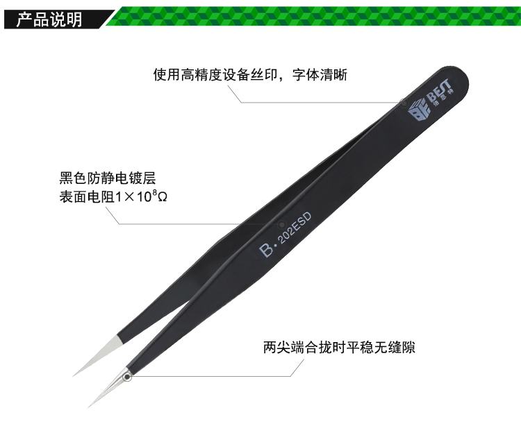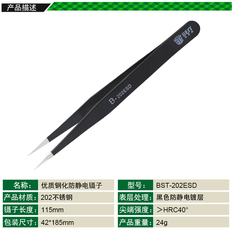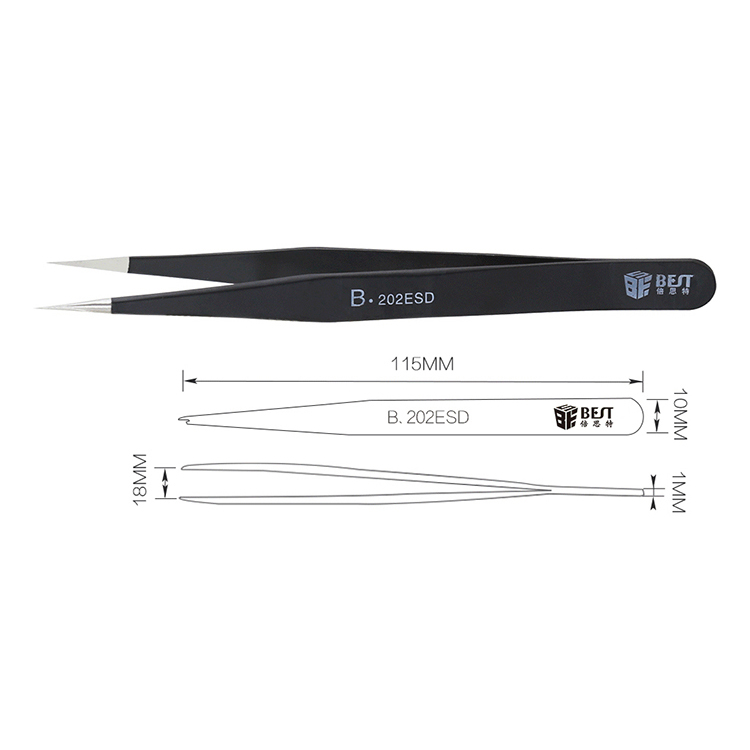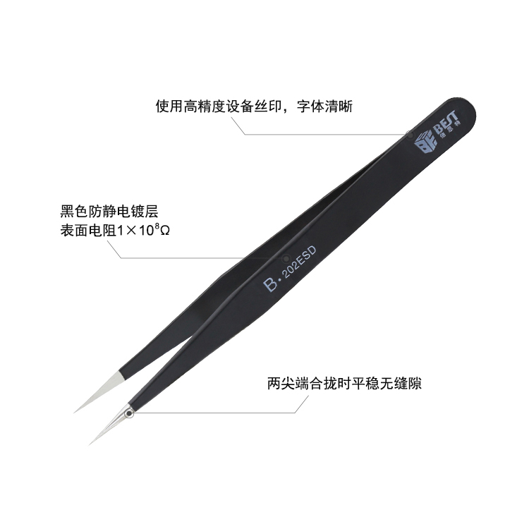 ? 产品名称: 优质钢化防静电镊子? 产品型号: BST-202ESD? 产品类别: 镊子系列