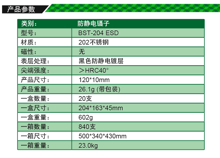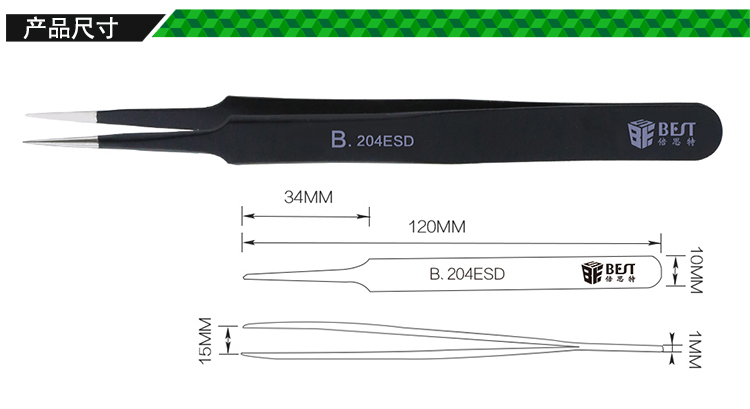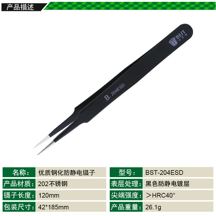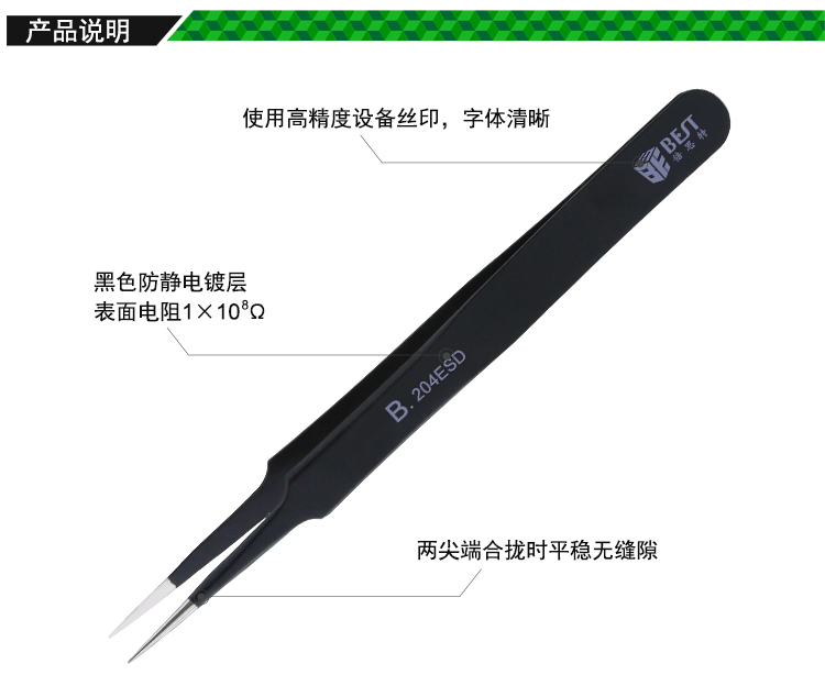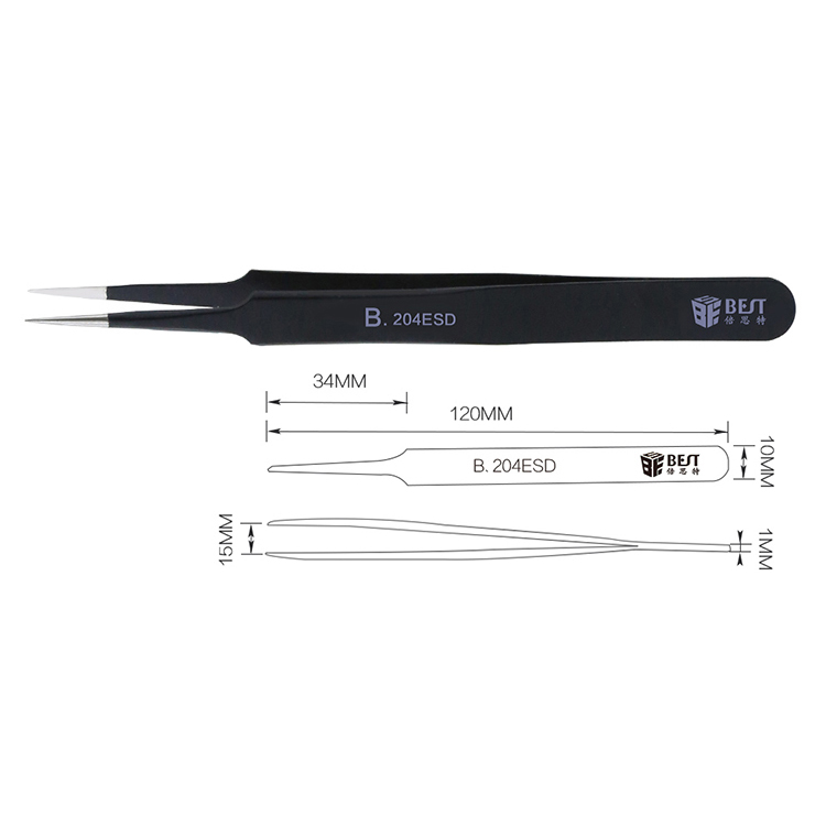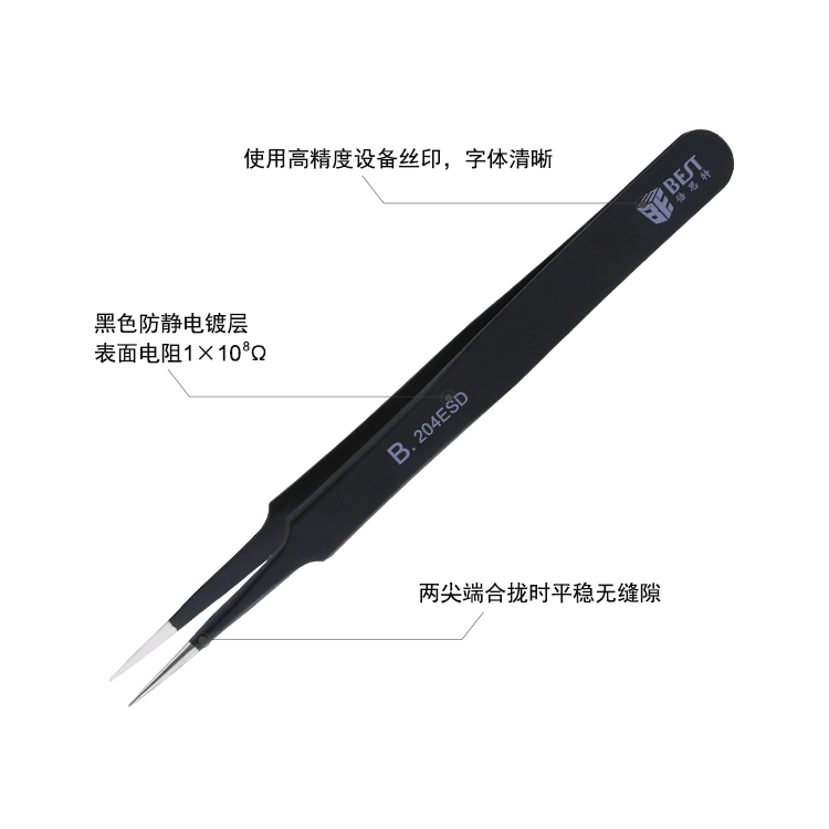 ? 产品名称: 优质钢化防静电镊子? 产品型号: BST-204ESD? 产品类别: 镊子系列