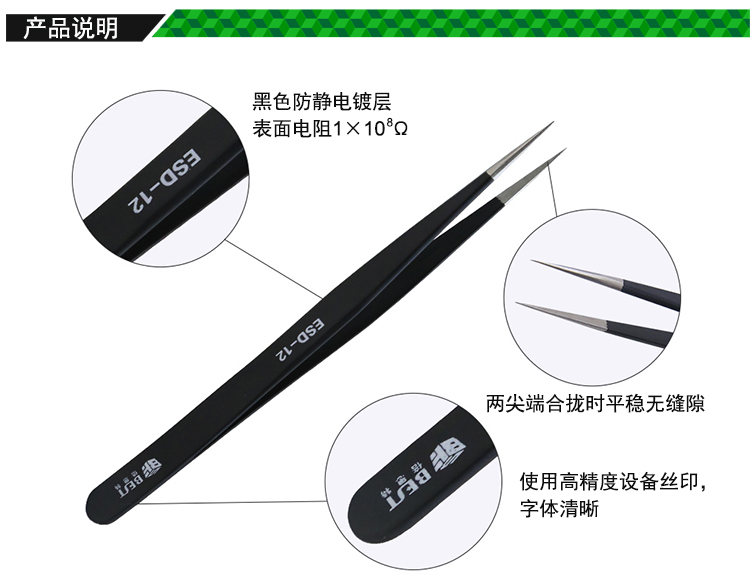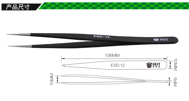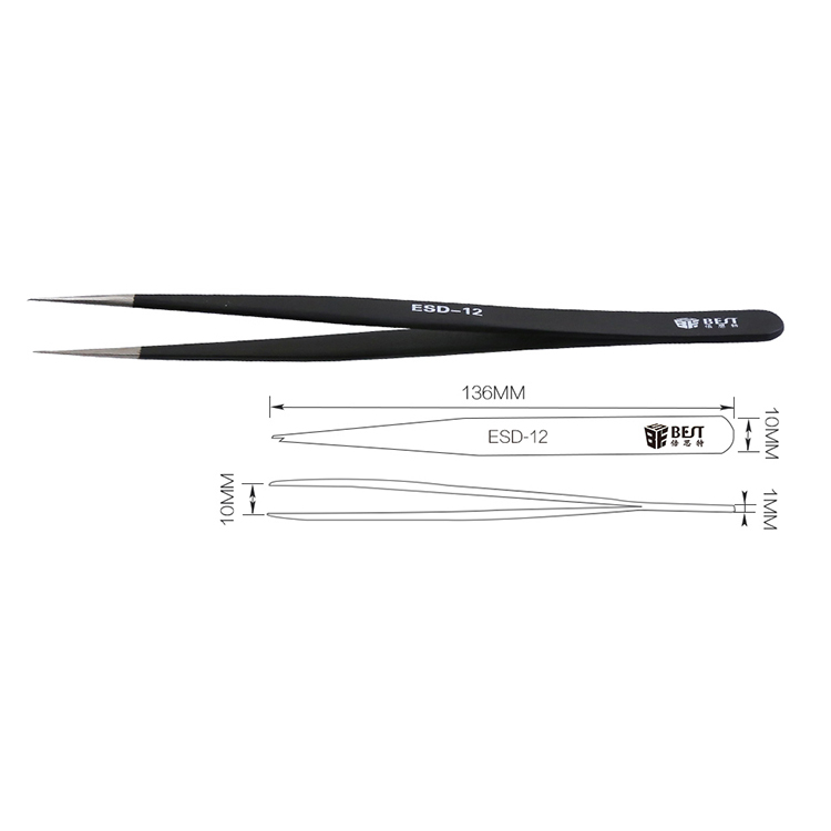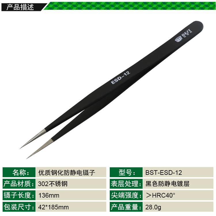 ? 产品名称: 优质钢化高级防静电镊子? 产品型号: BST-ESD-12? 产品类别: 镊子系列