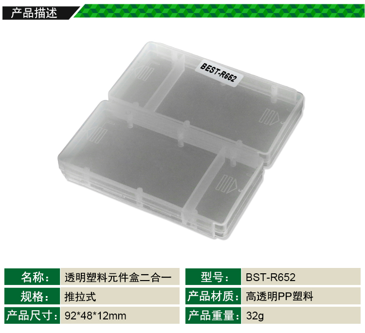 ? 产品名称: 透明塑料元件盒二合一? 产品型号: BST-R652? 产品类别: 元件盒系列