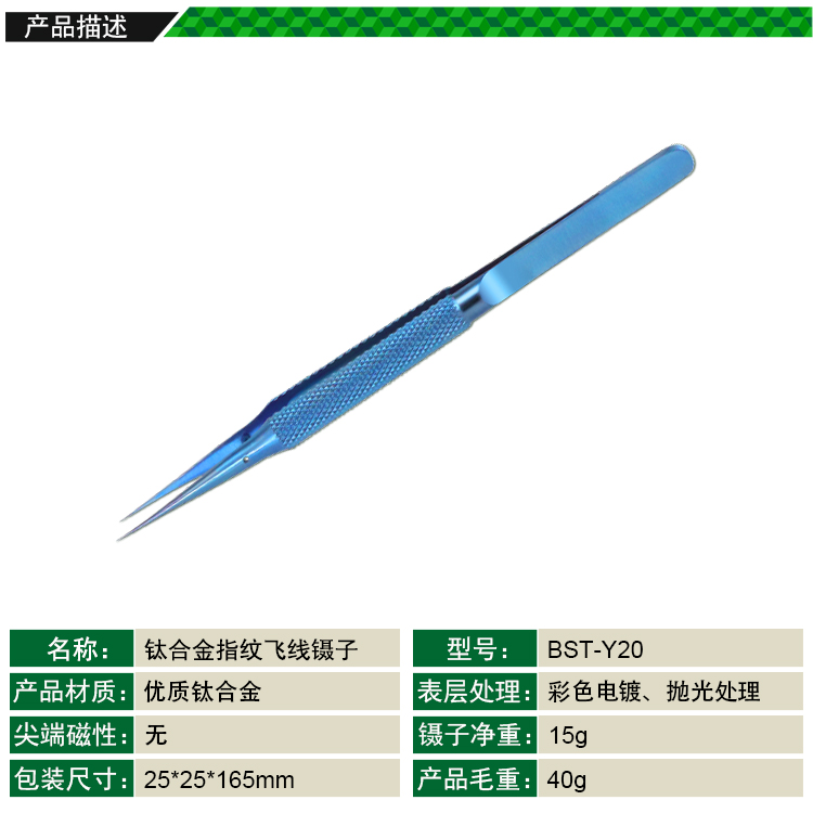 ? 产品名称: 钛合金细尖直镊子? 产品型号: BST-Y20? 产品类别: 镊子系列