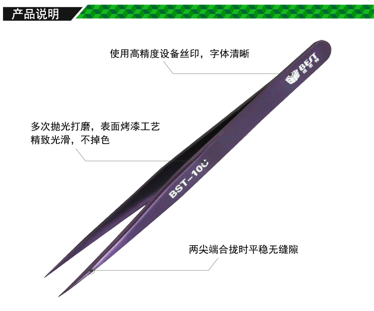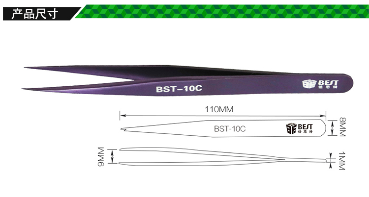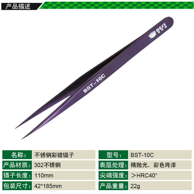 ? 产品名称: 彩色镊子 不锈钢彩镀镊子? 产品型号: BST-10C? 产品类别: 镊子系列