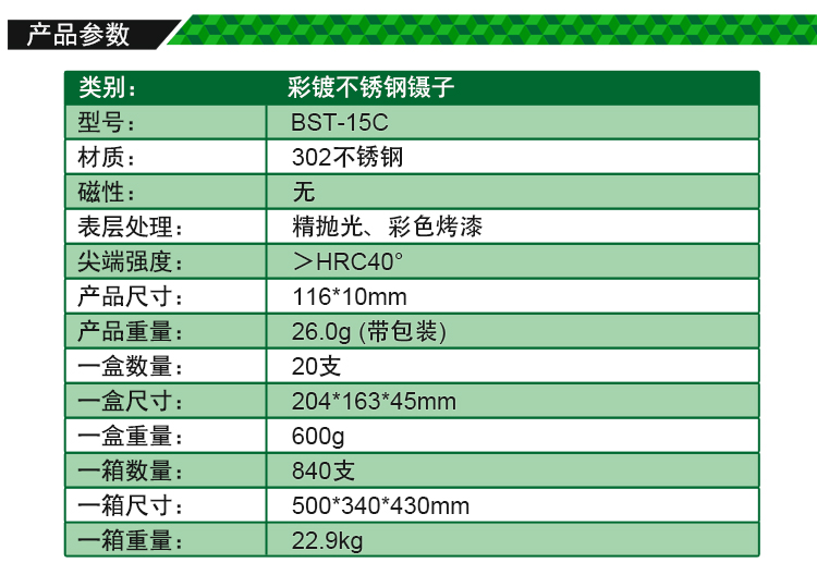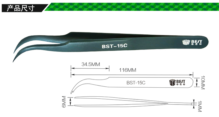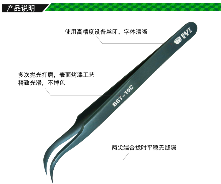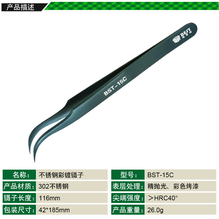 ? 产品名称: 彩色镊子 不锈钢彩镀镊子? 产品型号: BST-15C? 产品类别: 镊子系列