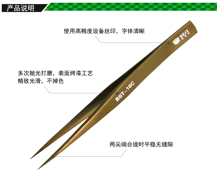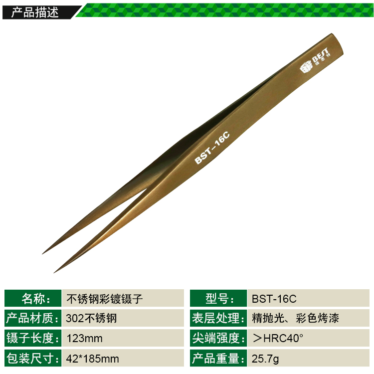 ? 产品名称: 彩色镊子 不锈钢彩镀镊子? 产品型号: BST-16C? 产品类别: 镊子系列