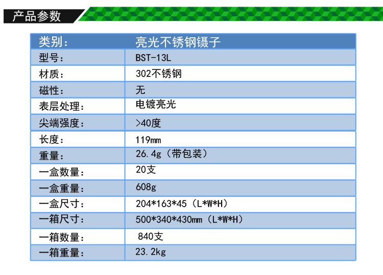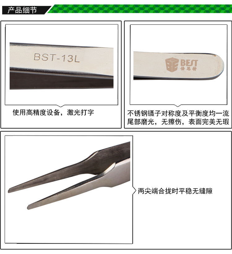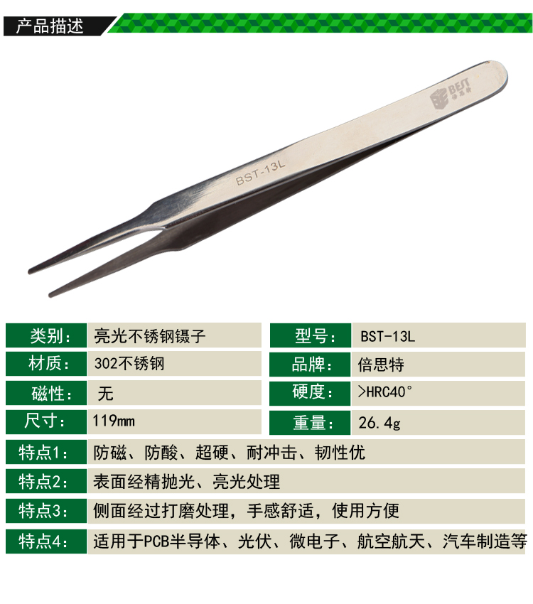 ? 产品名称: 亮光镊子 不锈钢镊子? 产品型号: BST-13L? 产品类别: 镊子系列