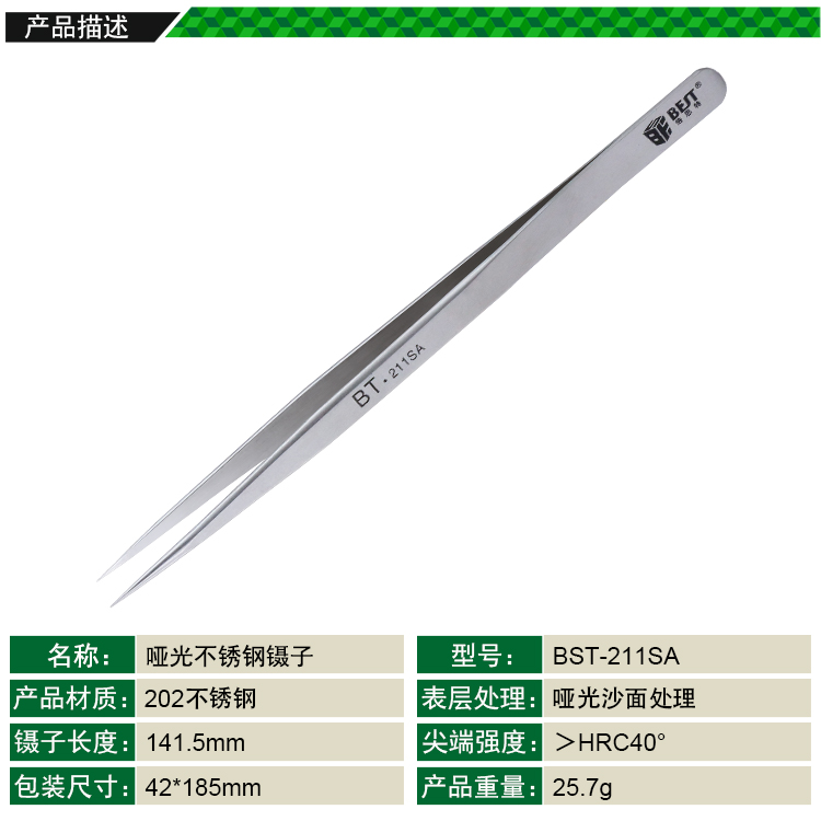 ? 产品名称: 亚光镊子 不锈钢镊子? 产品型号: BST-211SA? 产品类别: 镊子系列