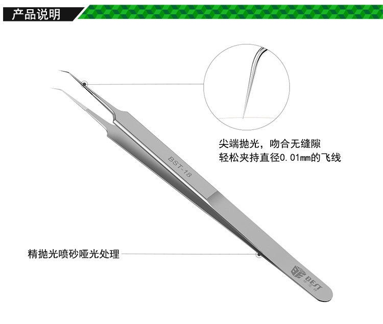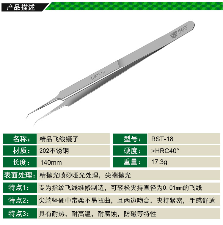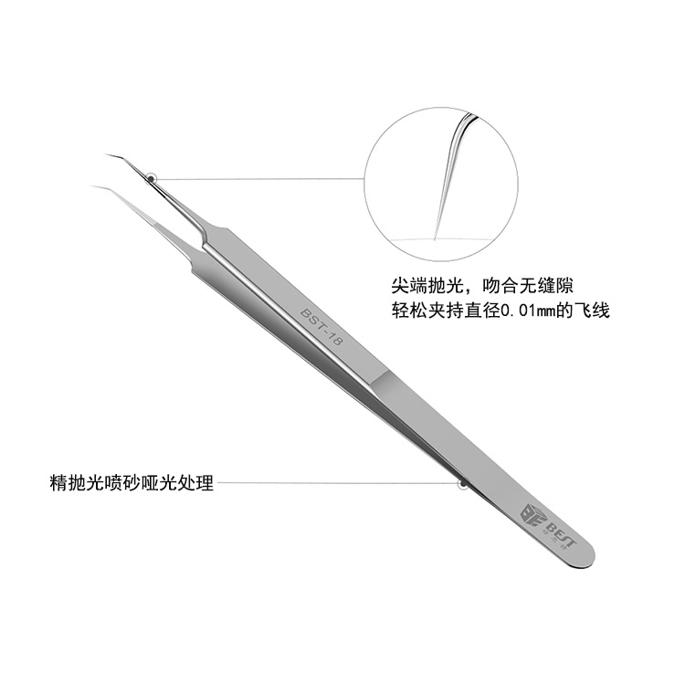 ? 产品名称: 精品飞线镊子 特尖镊子? 产品型号: BST-18? 产品类别: 镊子系列