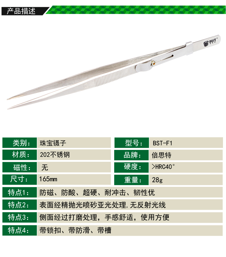 ? 产品名称: 珠宝镊子 带扣镊子? 产品型号: BST-F1? 产品类别: 镊子系列
