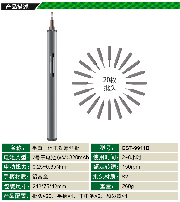 ? 产品名称: 手自一体电动螺丝批(干电池款)? 产品型号: BST-9911B? 产品类别: 电动螺丝刀系列