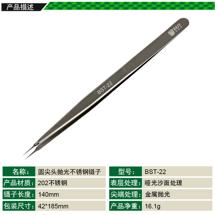 ? 产品名称: 圆尖头抛光直镊子? 产品型号: BST-22? 产品类别: 镊子系列
