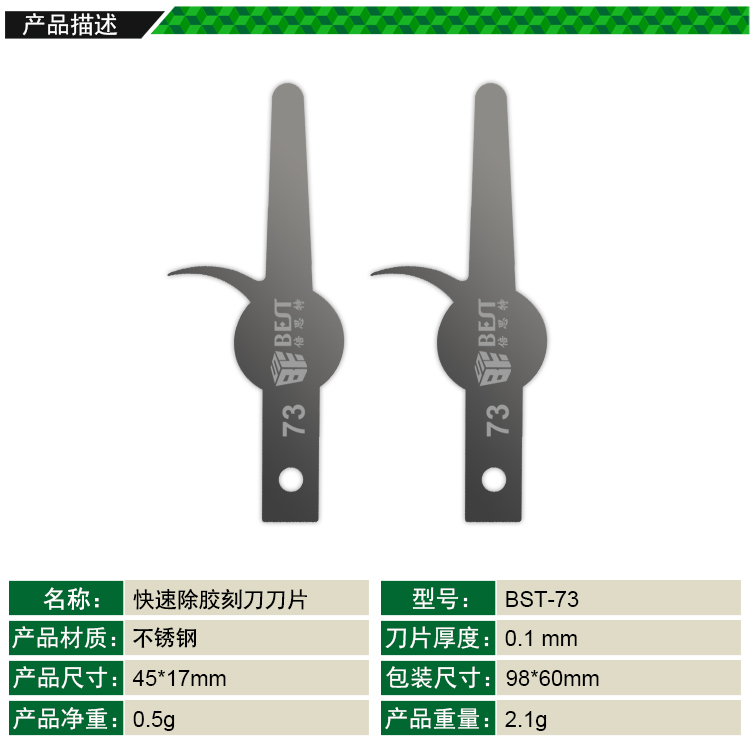 ? 产品名称: 快速除胶刻刀刀片? 产品型号: BST-73? 产品类别: 刀具系列