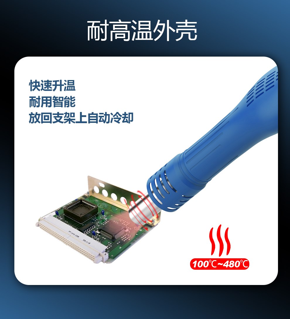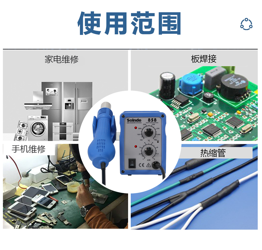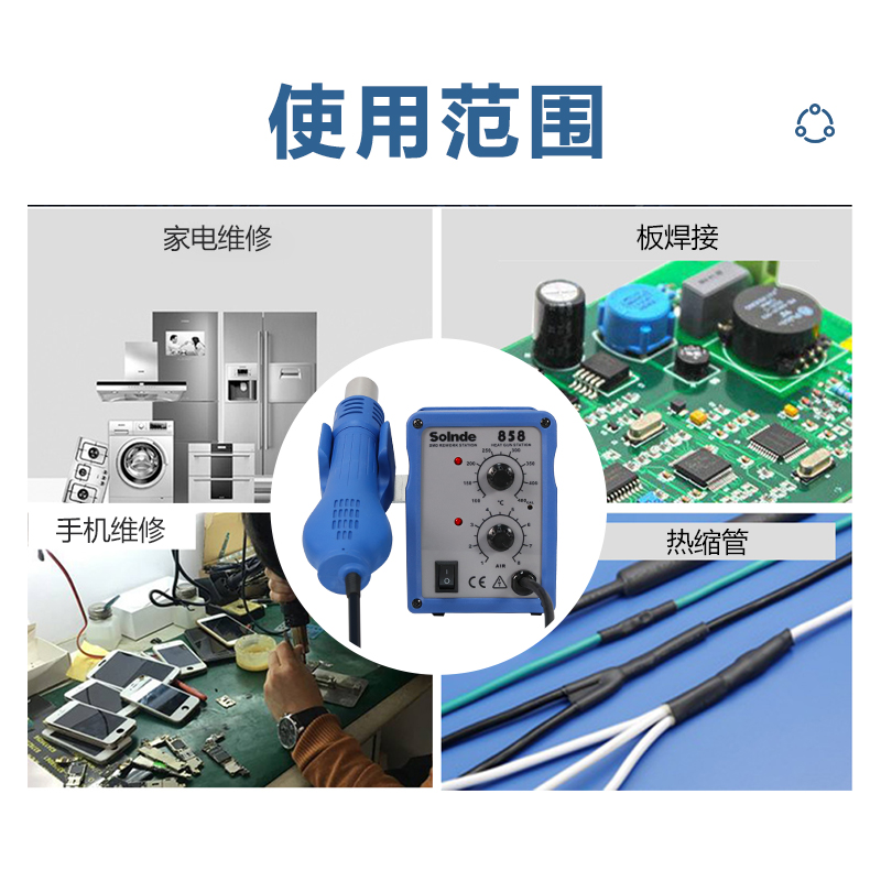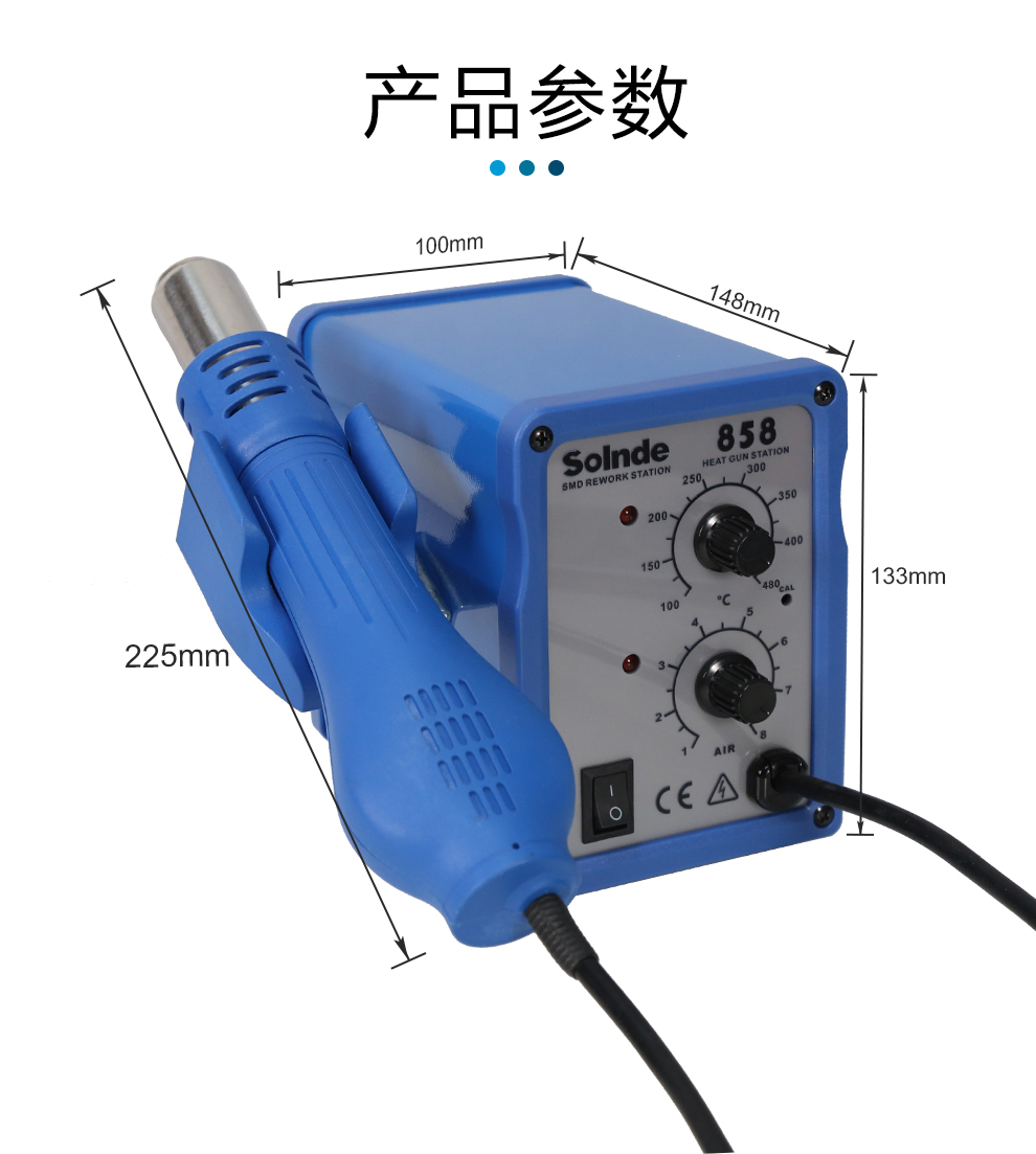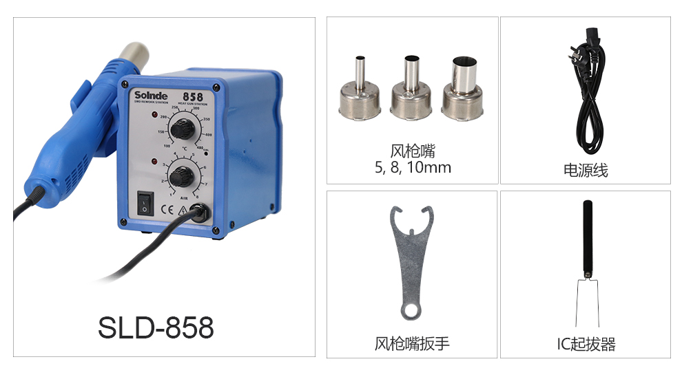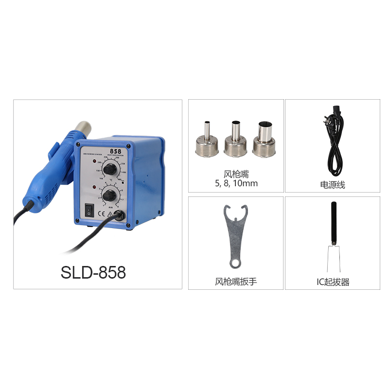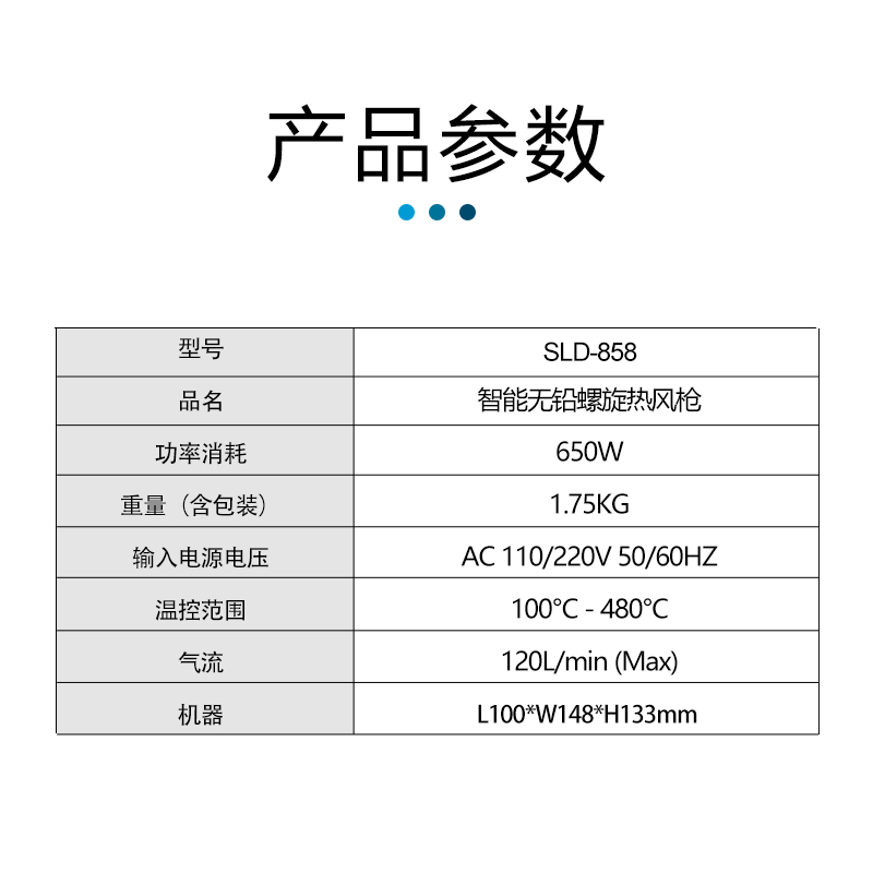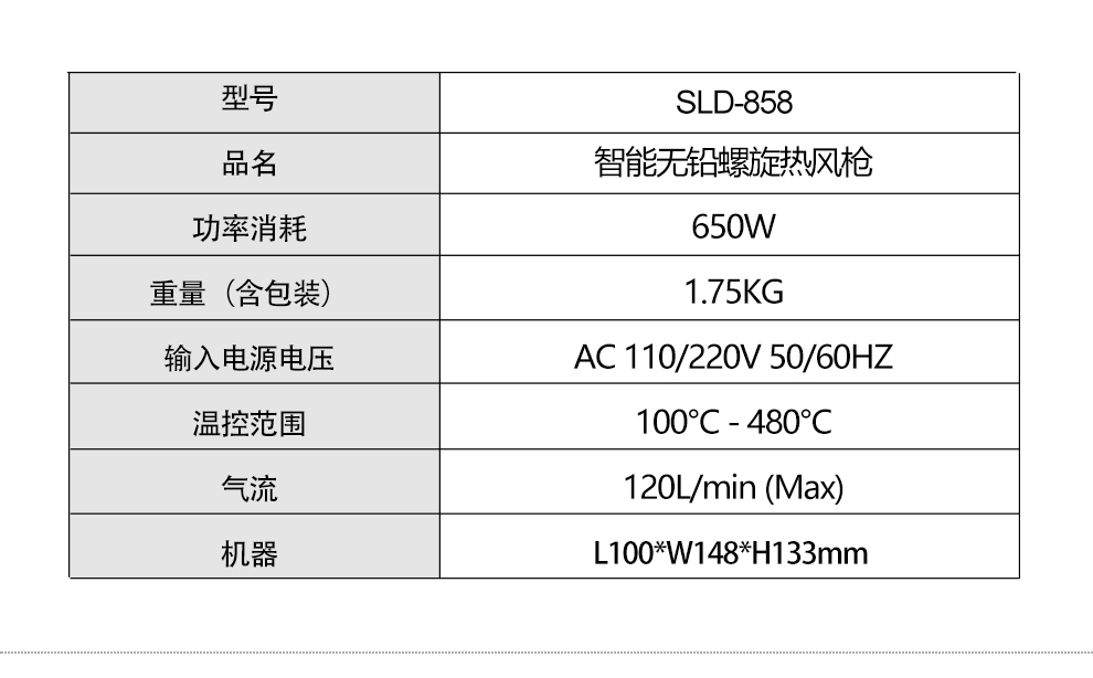 ? 产品名称: 无铅螺旋式热风枪? 产品型号: SLD-858? 产品类别: 热风枪系列 ? 额定电压: AC 110V/220V 50Hz/60Hz? 总机功率: 650W±10% (Max)? 工作环境: 0~40℃ 相对湿度<80%? 储存环境: -20~80℃ 相对湿度35~45%? 温控范围: 100℃~480℃? 气流类型: 无刷风机/柔和风? 气流量: 120L/min(Max)? 包装尺寸: 260*165*150mm? 产品重量: 1.75kg