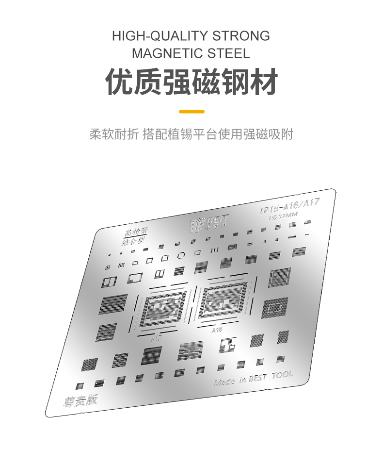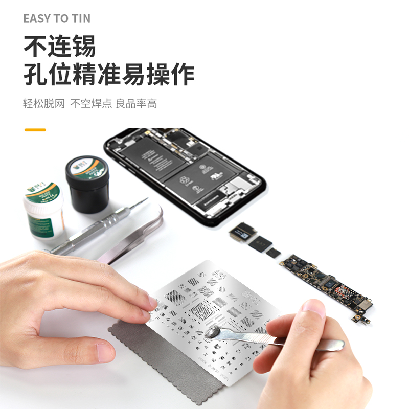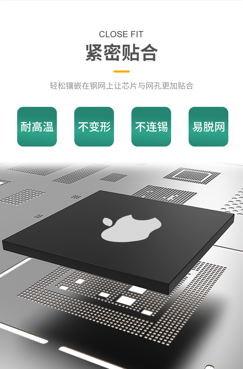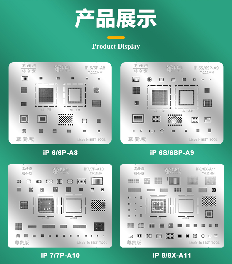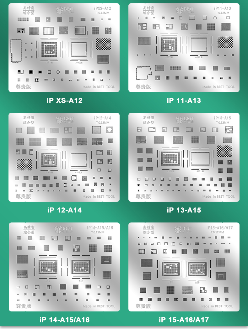 返回当前位置: 首页 / 产品中心 / BST-IP(A8-A17)苹果CPU系列专用植锡网 适用于iP6~15植锡钢网 多用植锡方孔定位钢网 植锡卡套装10pcs