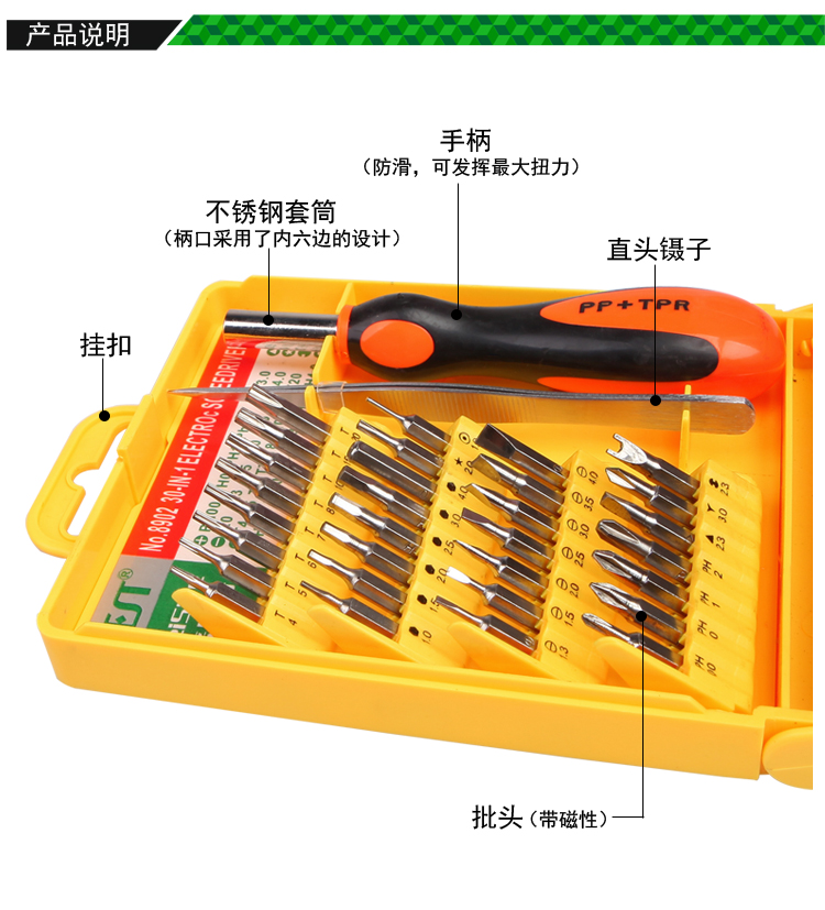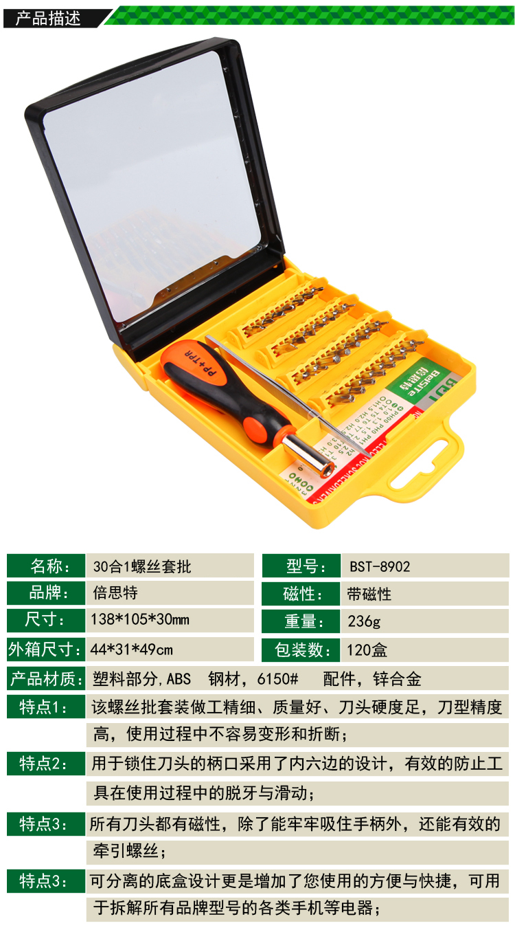 ? 产品名称: 螺丝刀套装30合1? 产品型号: BST-8902? 产品类别: 螺丝批系列