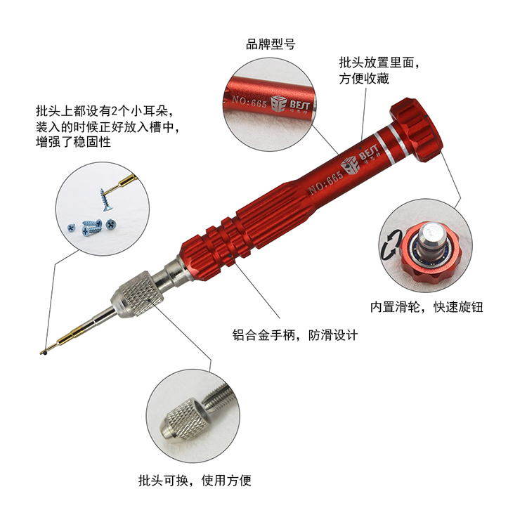? 产品名称: 五合一电讯工具 多功能螺丝批? 产品型号: BST-665? 产品类别: 螺丝批系列? 手柄材质: 铝合金? 批头材质: CR-V(铬钒钢)? 产品尺寸: 130*18mm? 产品重量: 46.5g