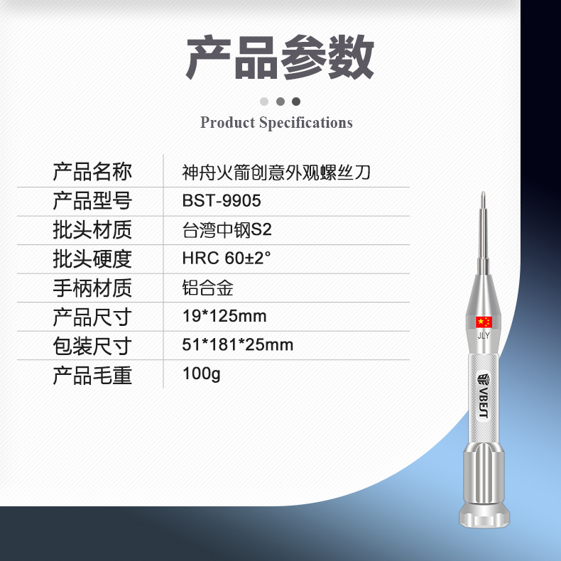 返回当前位置: 首页 / 产品中心 / BST-9905 精密航空铝合金螺丝刀 S2螺丝刀头 神舟火箭创意外观螺丝批 单支礼盒装