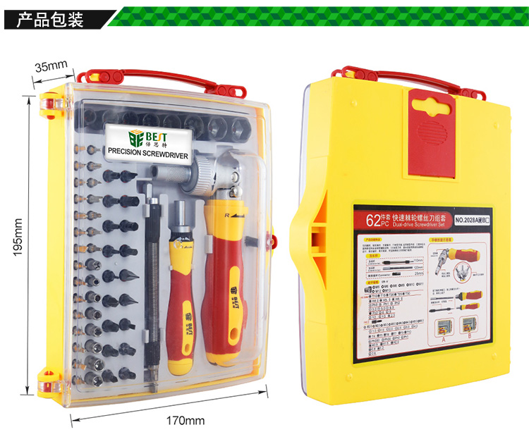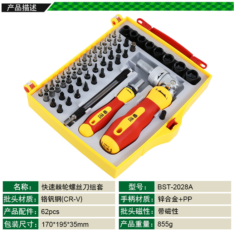 ? 产品名称: 62件套 快速棘轮螺丝刀组套? 产品型号: BST-2028A? 产品类别: 螺丝批系列