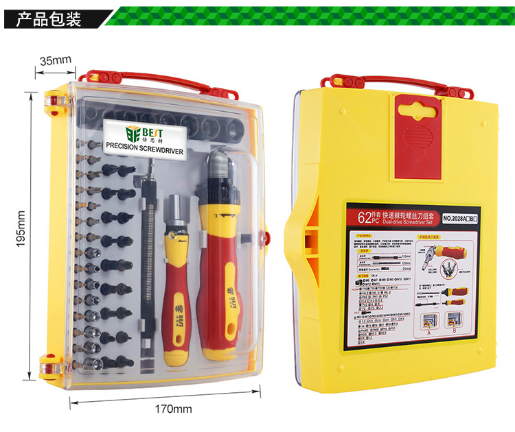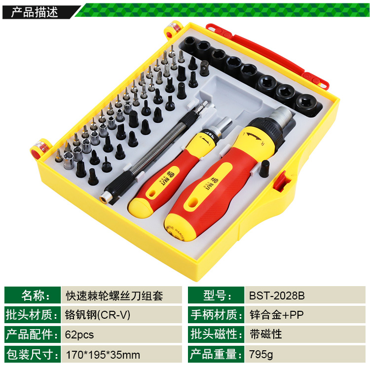 ? 产品名称: 62件套 快速棘轮螺丝刀组套? 产品型号: BST-2028B? 产品类别: 螺丝批系列