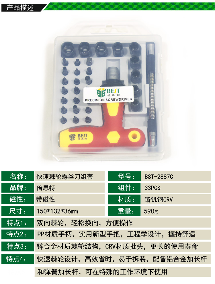 ? 产品名称: 33件套 快速棘轮螺丝刀组套? 产品型号: BST-2887C? 产品类别: 螺丝批系列