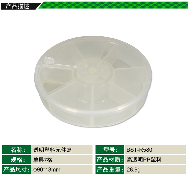 ? 产品名称: 7格透明塑料元件盒? 产品型号: BST-R580? 产品类别: 元件盒系列