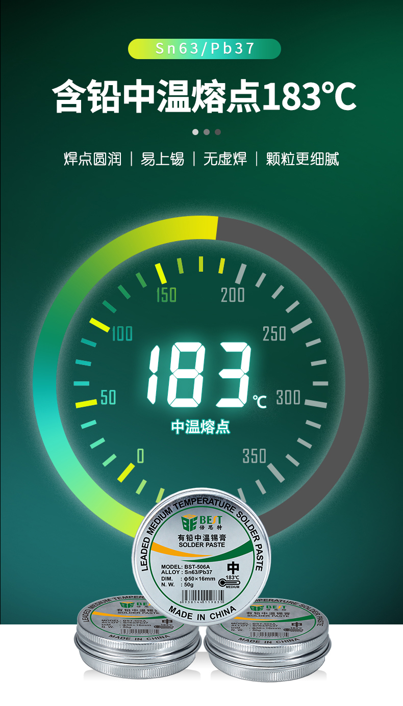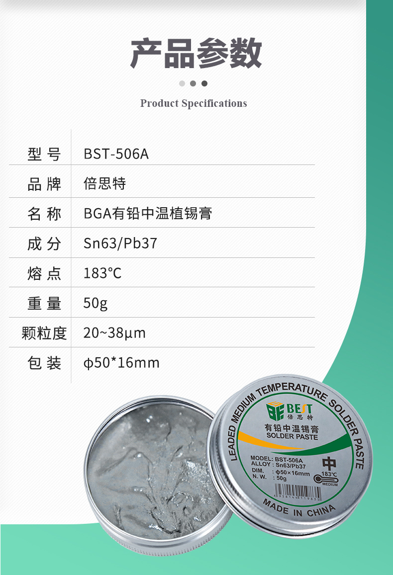 ? 产品名称: 有铅中温锡膏? 产品型号: BST-506A? 产品类别: 锡浆焊油系列? 产品成分: Sn63/Pb37? 产品重量: 50g