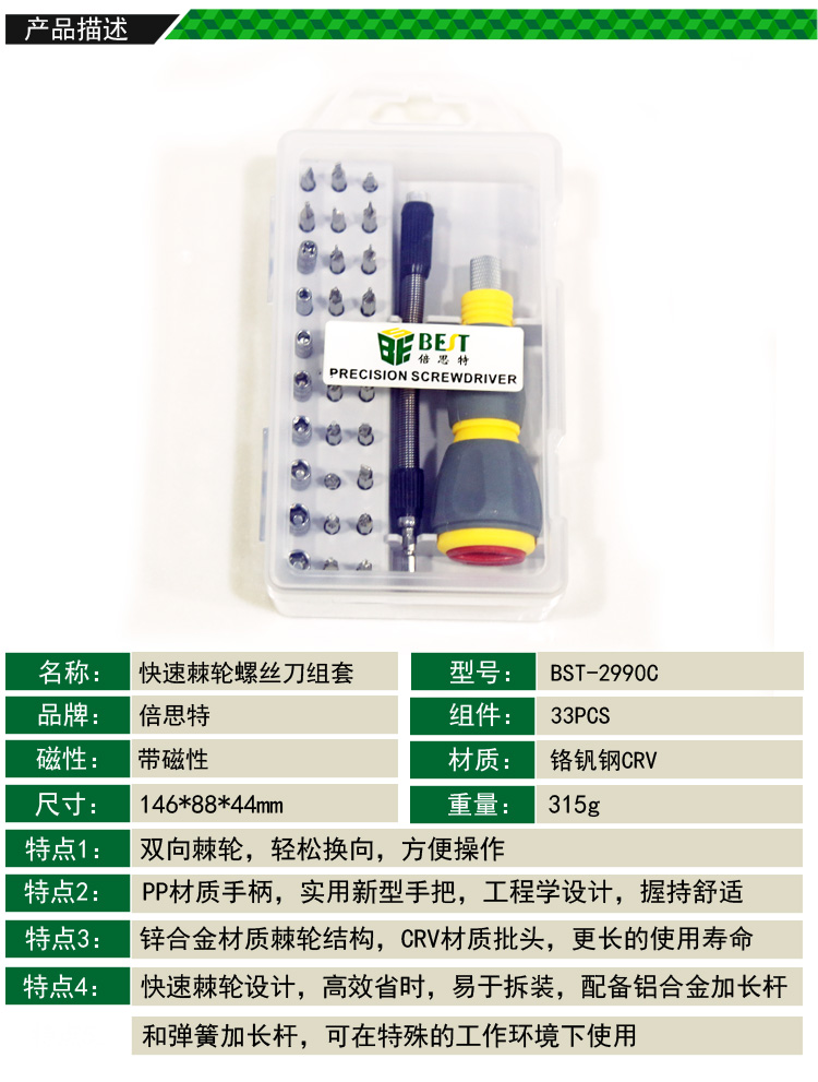 ? 产品名称: 33件套 快速棘轮螺丝刀组套? 产品型号: BST-2990C? 产品类别: 螺丝批系列