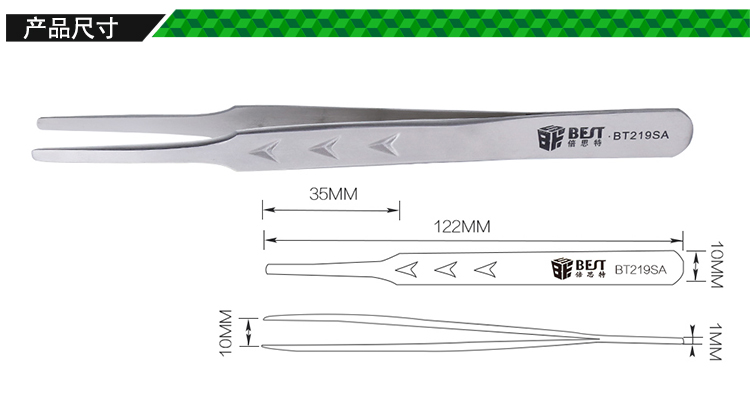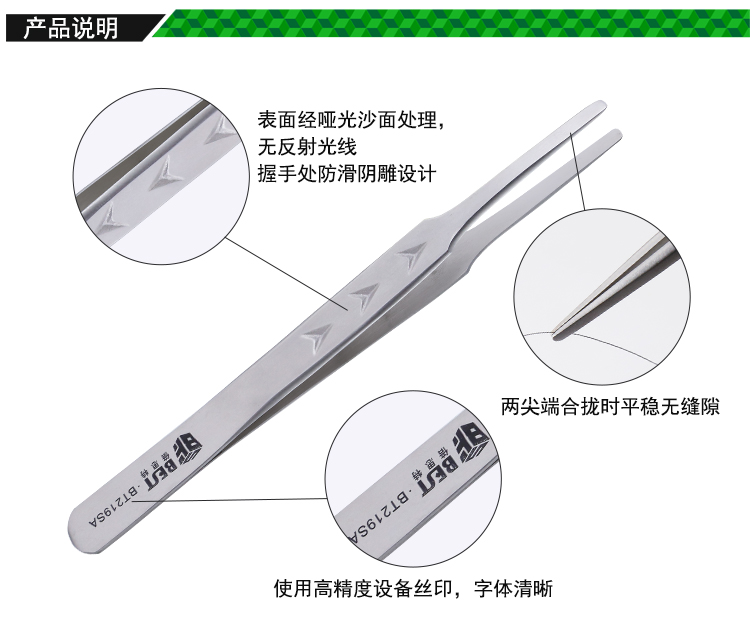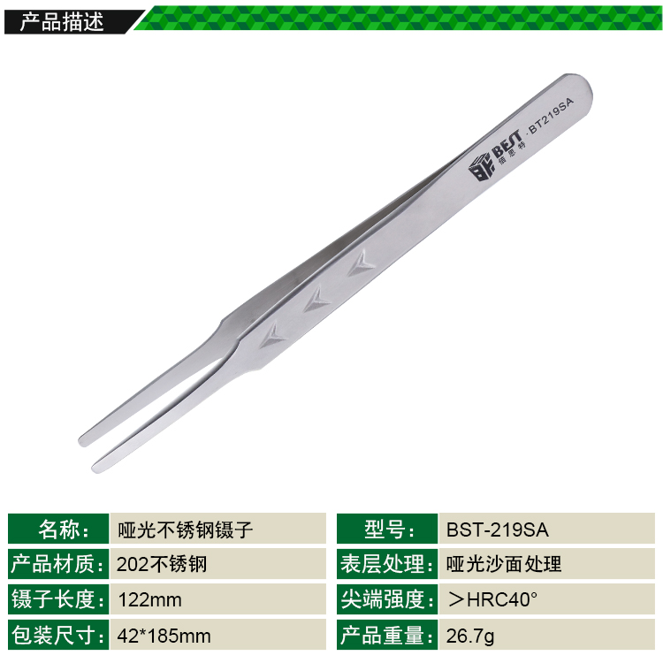 ? 产品名称: 亚光沙面镊子 不锈钢镊子? 产品型号: BST-219SA? 产品类别: 镊子系列