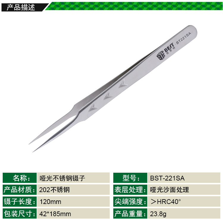 ? 产品名称: 亚光沙面镊子 不锈钢镊子? 产品型号: BST-221SA? 产品类别: 镊子系列