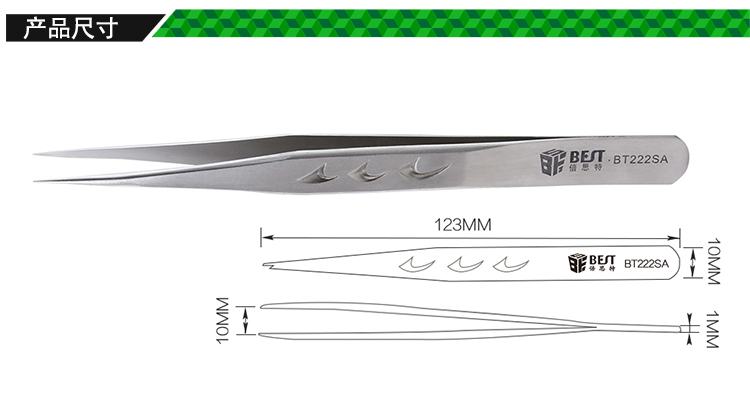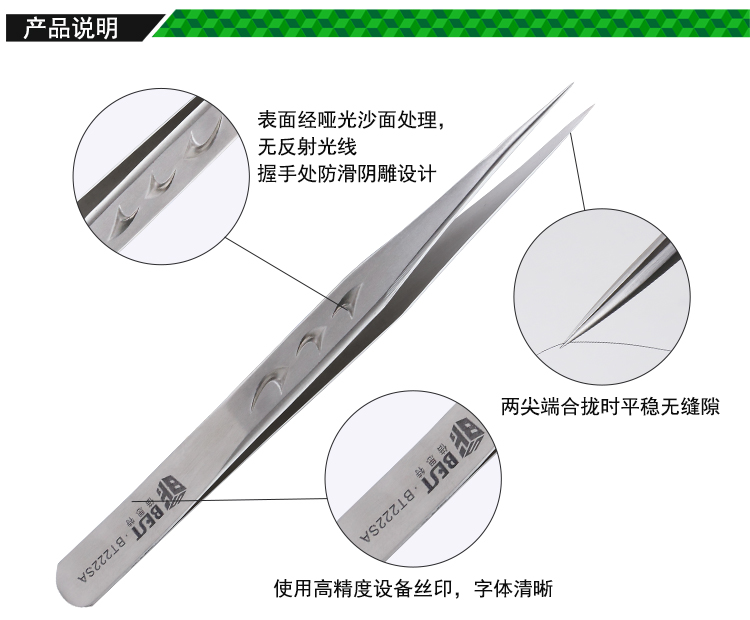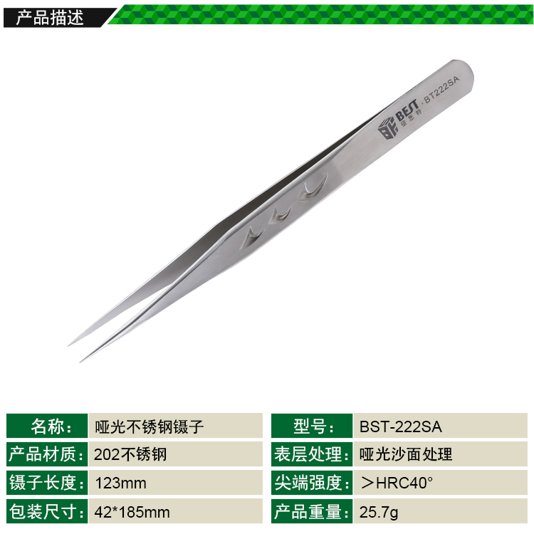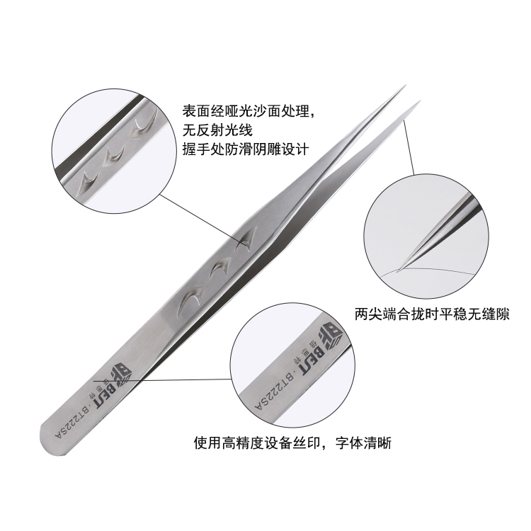 ? 产品名称: 亚光沙面镊子 不锈钢镊子? 产品型号: BST-222SA? 产品类别: 镊子系列