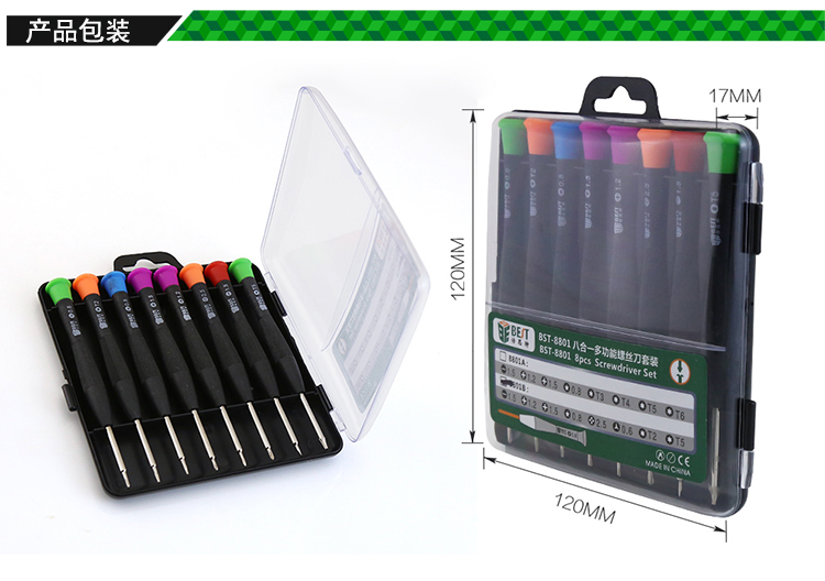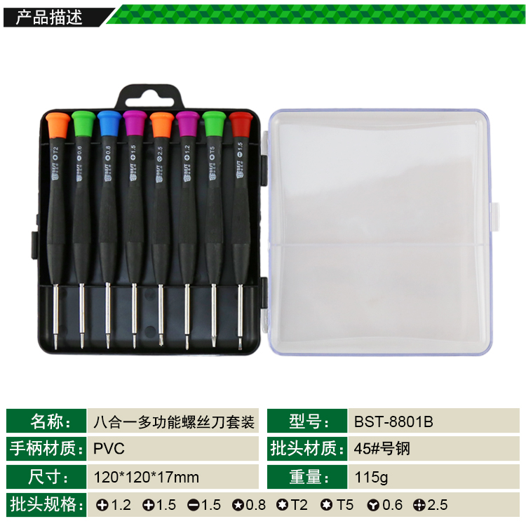 ? 产品名称: 八合一多功能螺丝刀套装? 产品型号: BST-8801B? 产品类别: 螺丝批系列