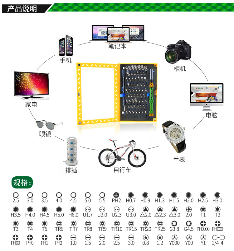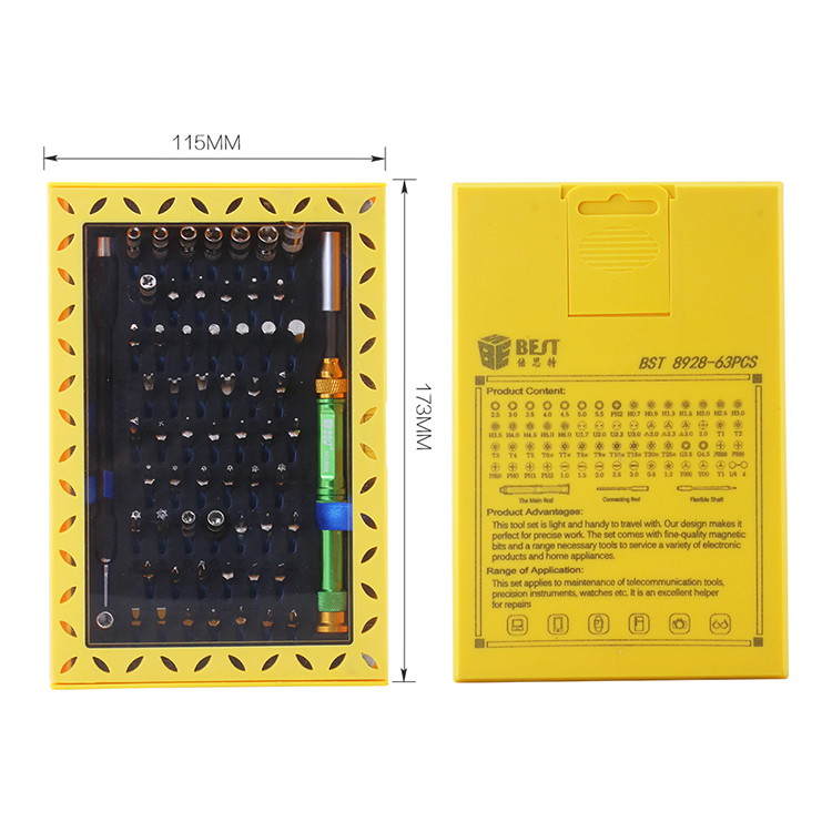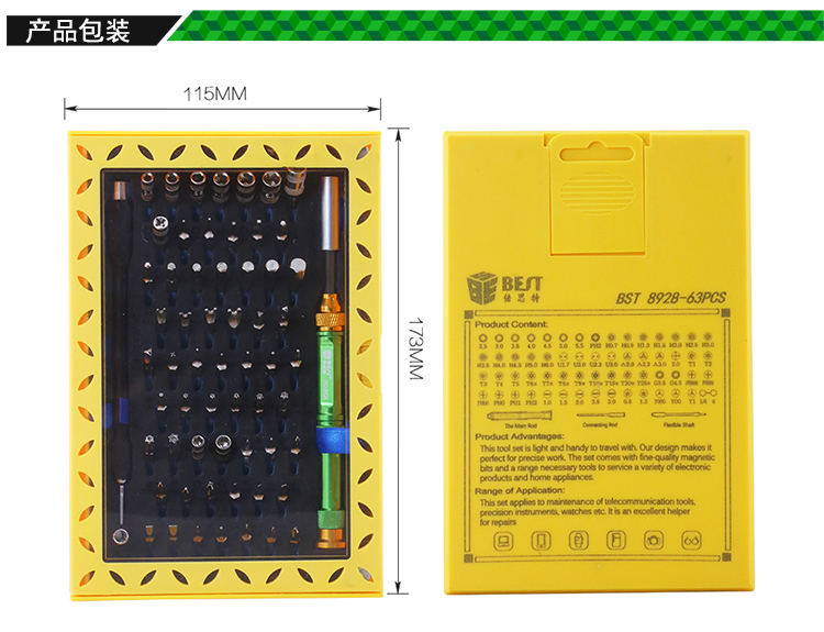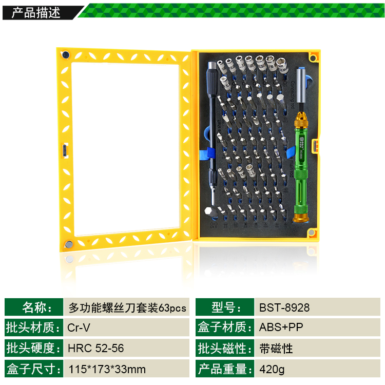 ? 产品名称: 多功能螺丝刀套装63pcs? 产品型号: BST-8928? 产品类别: 螺丝批系列