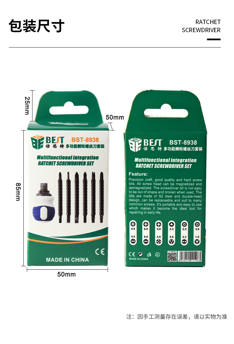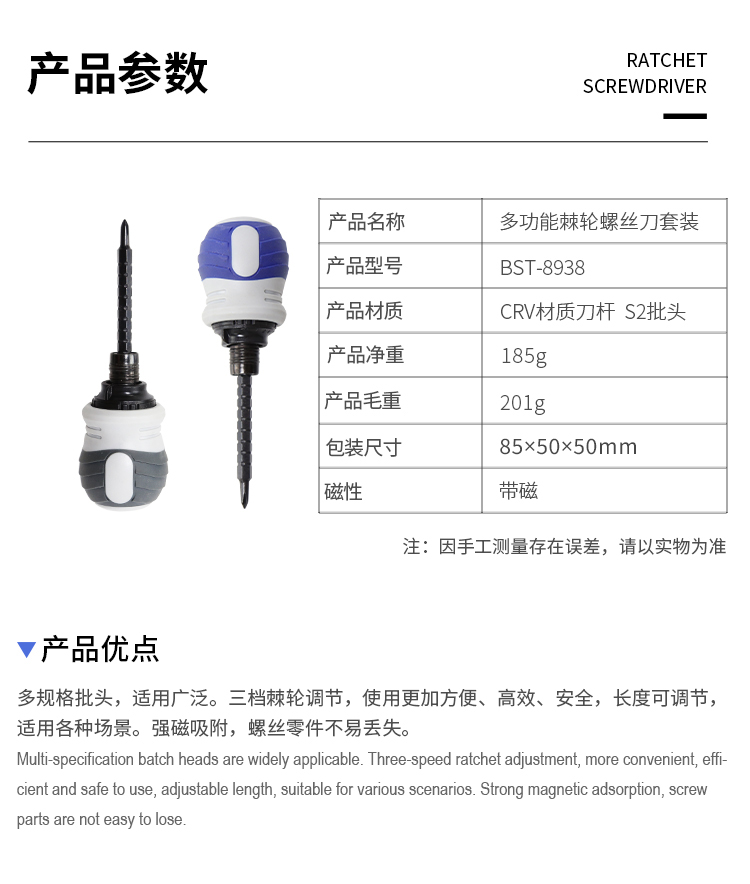? 产品名称: 多功能棘轮螺丝刀套装? 产品型号: BST-8938? 产品类别: 套批系列
