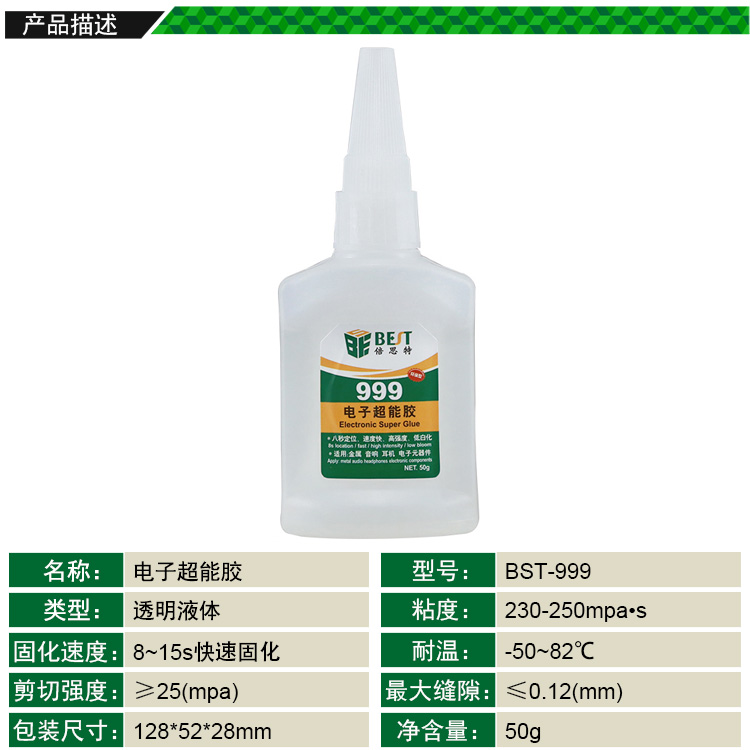 ? 产品名称: 电子超能胶 瞬间胶? 产品型号: BST-999? 产品类别: 胶水胶纸系列