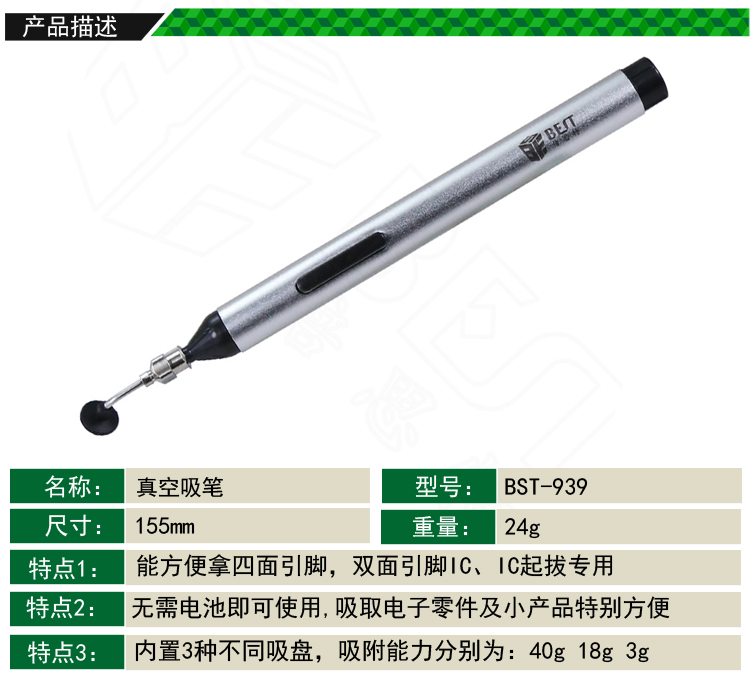 ? 产品名称: 真空吸笔(银)? 产品型号: BST-939? 产品类别: 吸锡器系列
