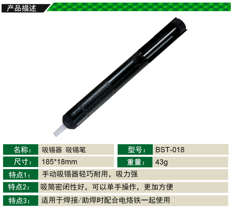 ? 产品名称: 吸锡器 吸锡笔? 产品型号: BST-018? 产品类别: 吸锡器系列