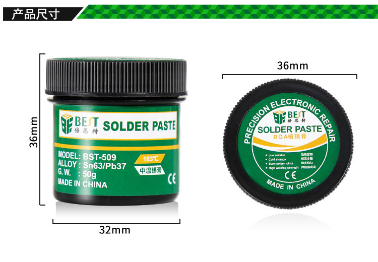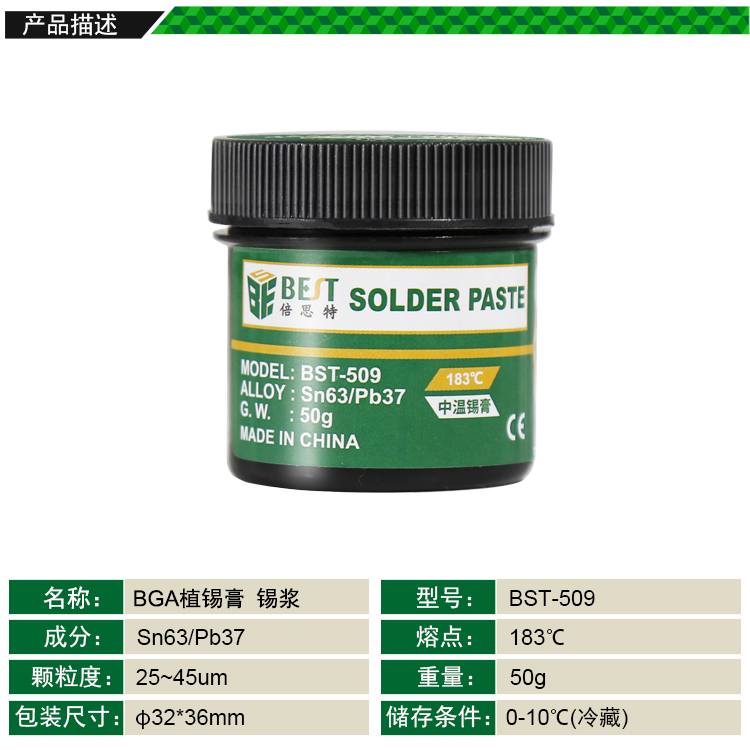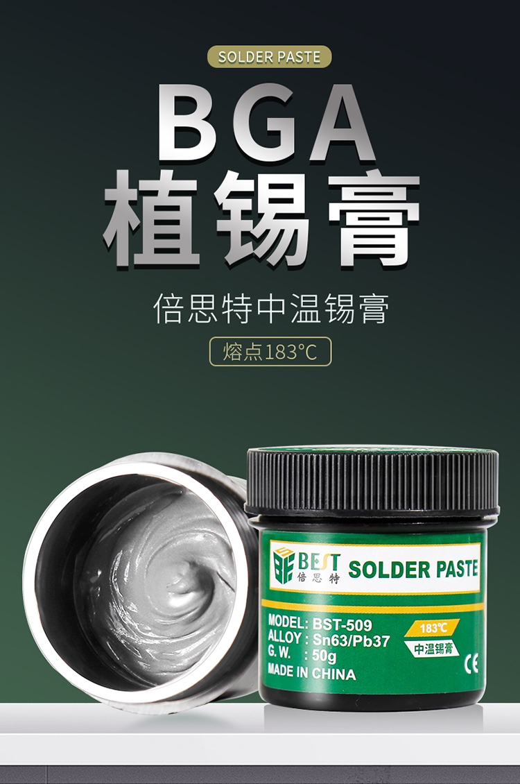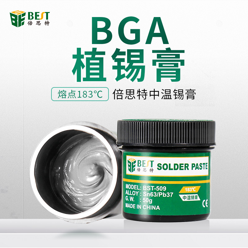 ? 产品名称: BGA植锡膏50g? 产品型号: BST-509? 产品类别: 锡浆焊油系列