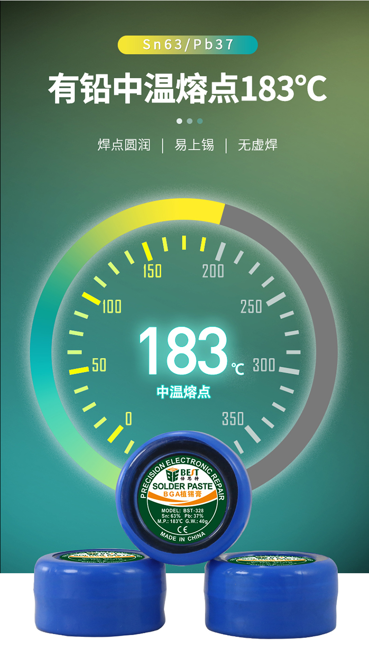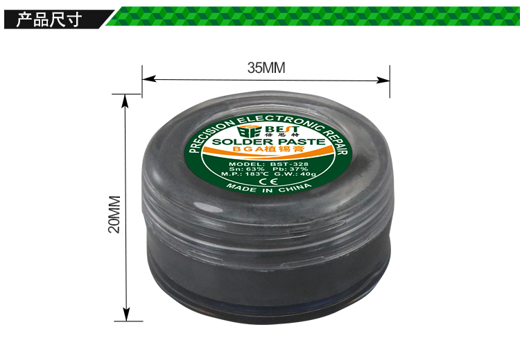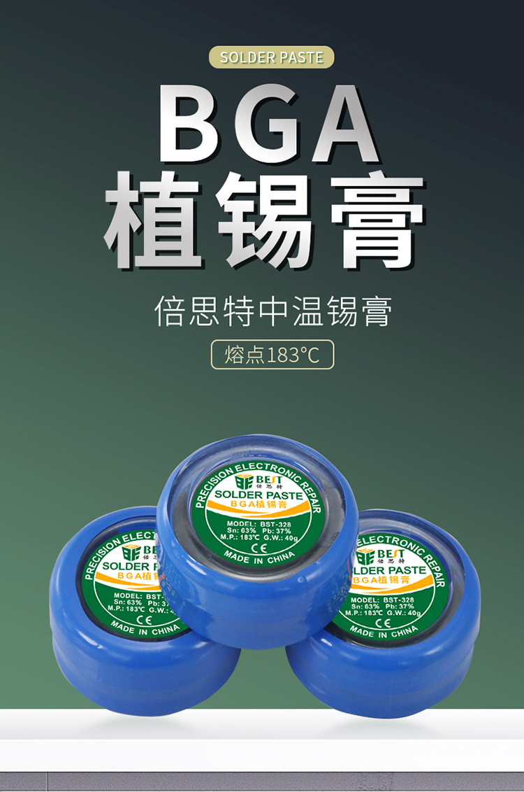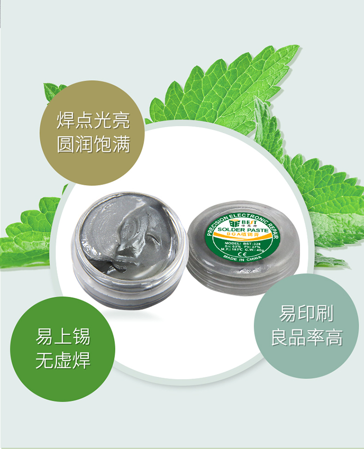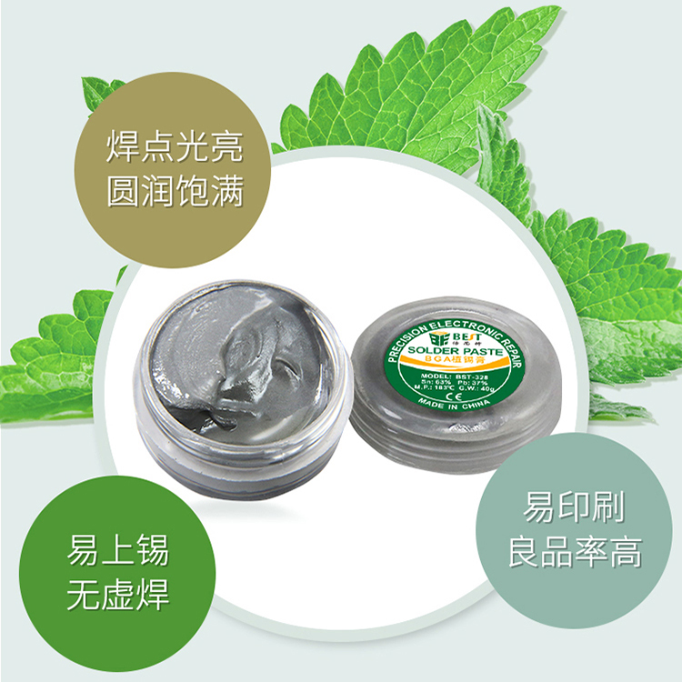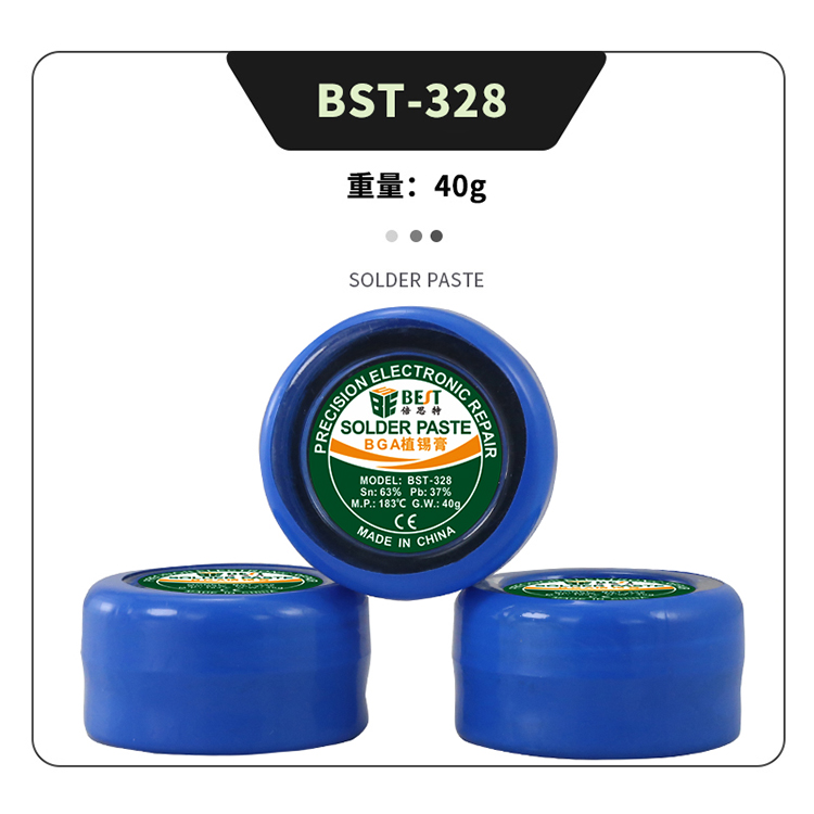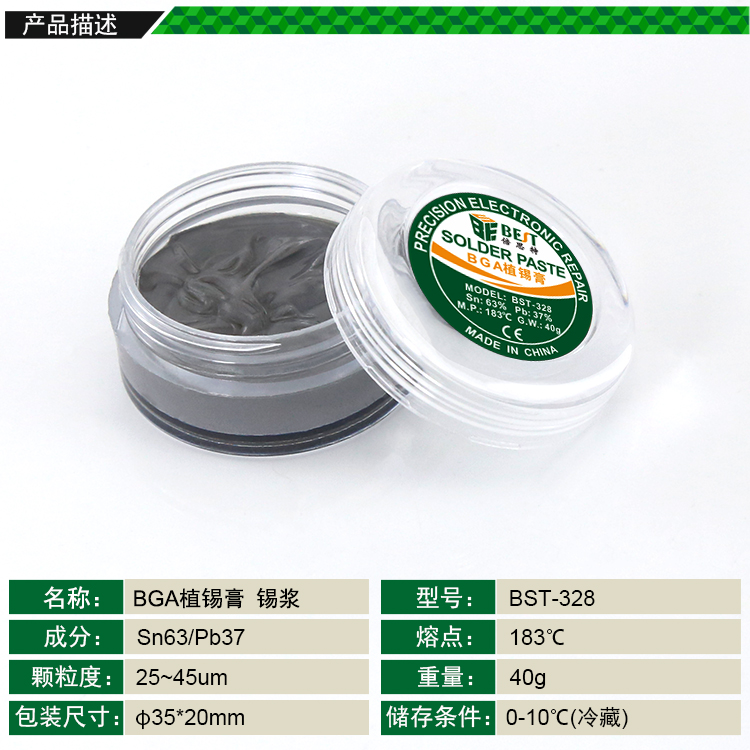 ? 产品名称: 中温锡浆 BGA植锡膏? 产品型号: BST-328? 产品类别: 锡浆焊油系列