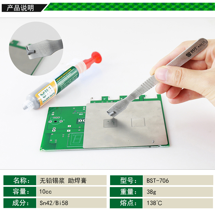 返回当前位置: 首页 / 产品中心 / BST-706 针筒式无铅锡浆 低温锡浆 焊锡膏 BGA植锡膏 Sn42/Bi58 10cc